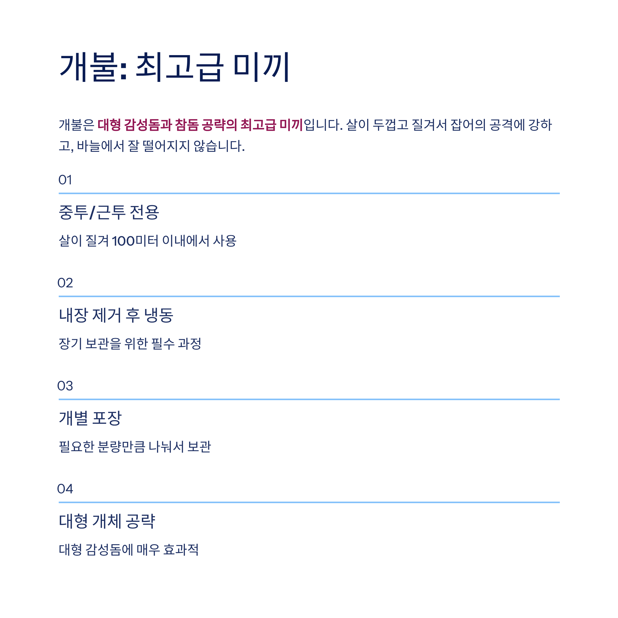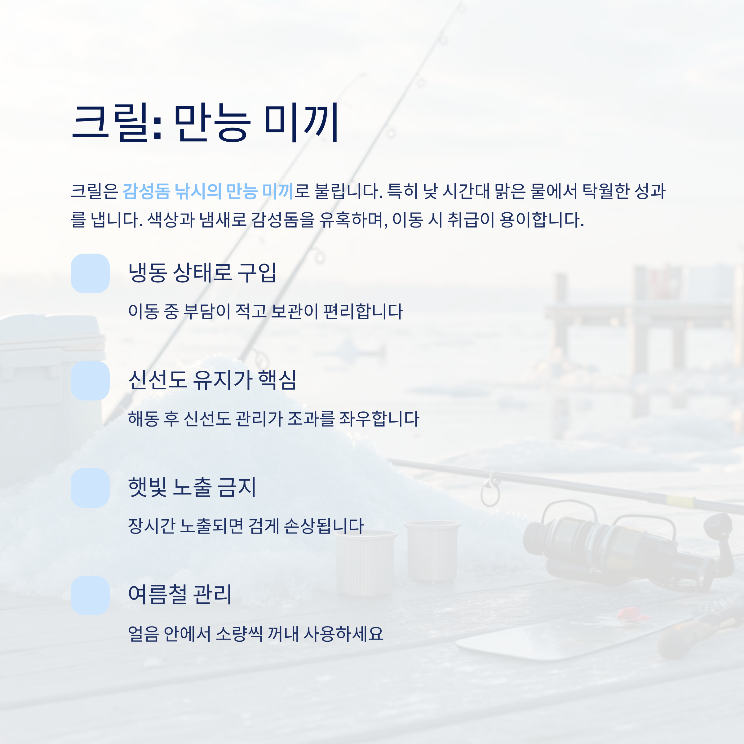크릴은 감성돔 낚시의 만능 미끼로 불립니다. 특히 낮 시간대 맑은 물에서 탁월한 성과를 냅니다. 색상과 냄새로 감성돔을 유혹하며, 이동 시 취급이 용이합니다.