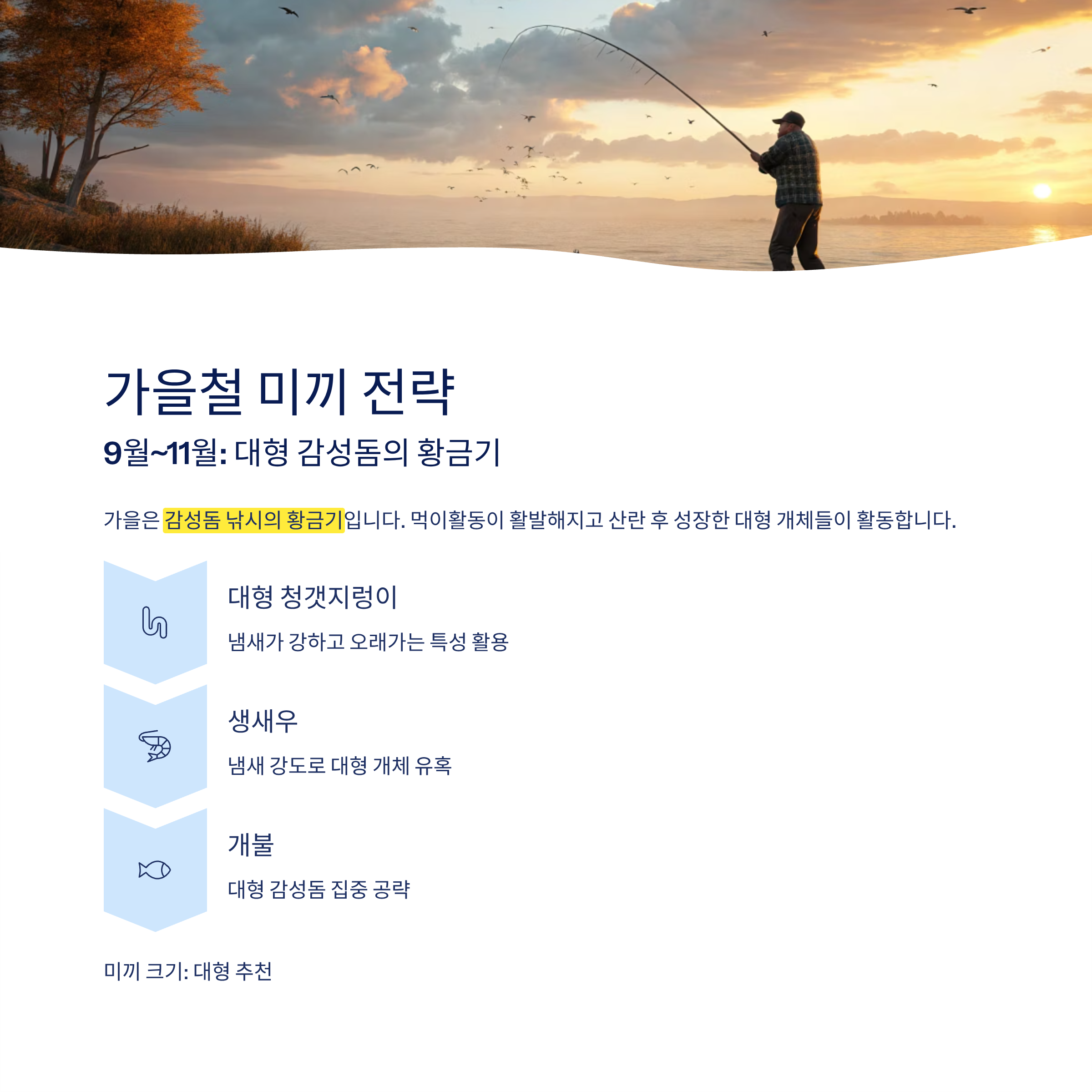 가을은 감성돔 낚시의 황금기입니다. 먹이활동이 활발해지고 산란 후 성장한 대형 개체들이 활동합니다.