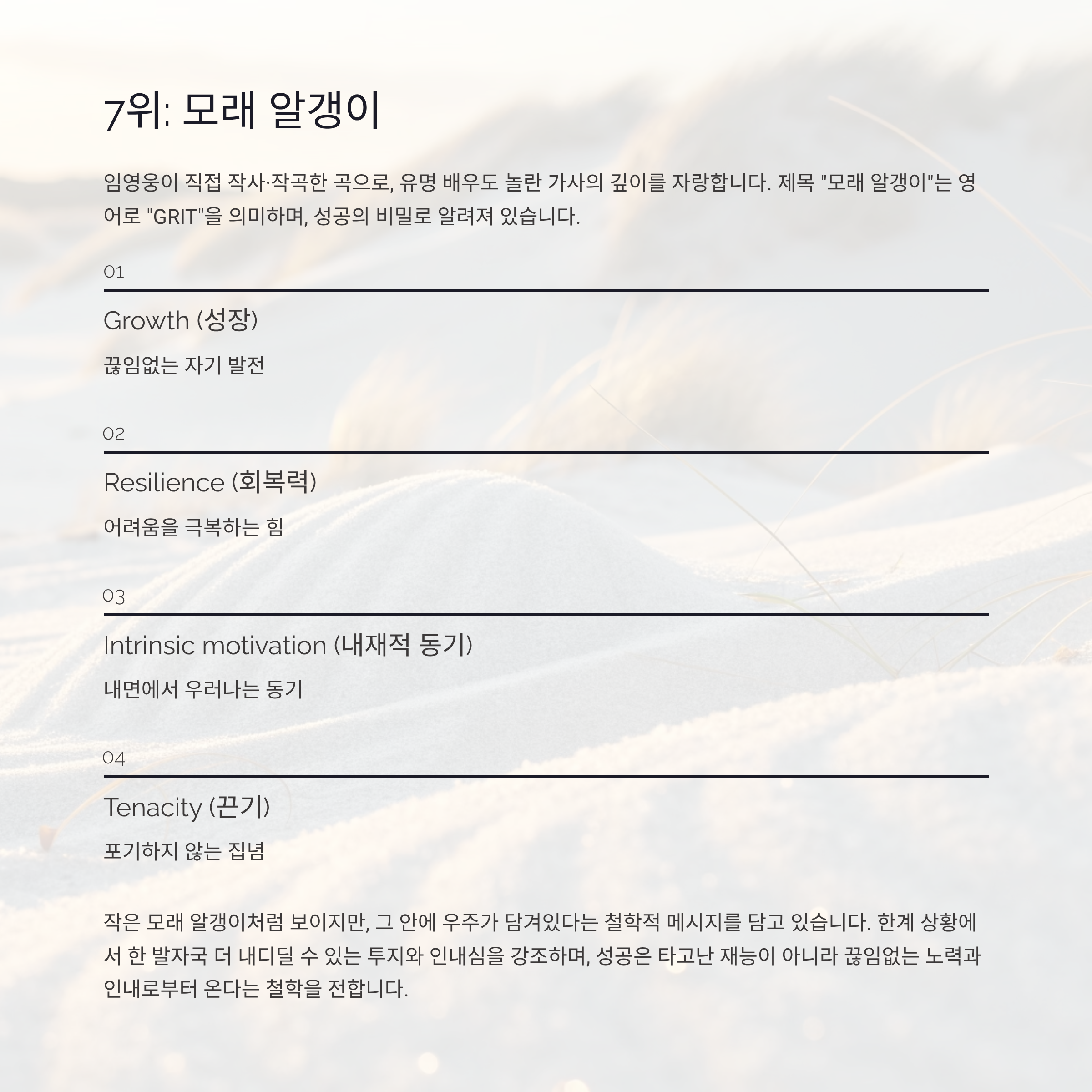 A2: "모래 알갱이"는 영어의 "GRIT"을 의미하며, 성공의 비밀로 불리는 끈기, 회복력, 성장, 내재적 동기를 상징합니다. 작은 것도 모이면 큰 힘이 되고, 한계를 극복하는 투지를 강조하는 곡입니다.