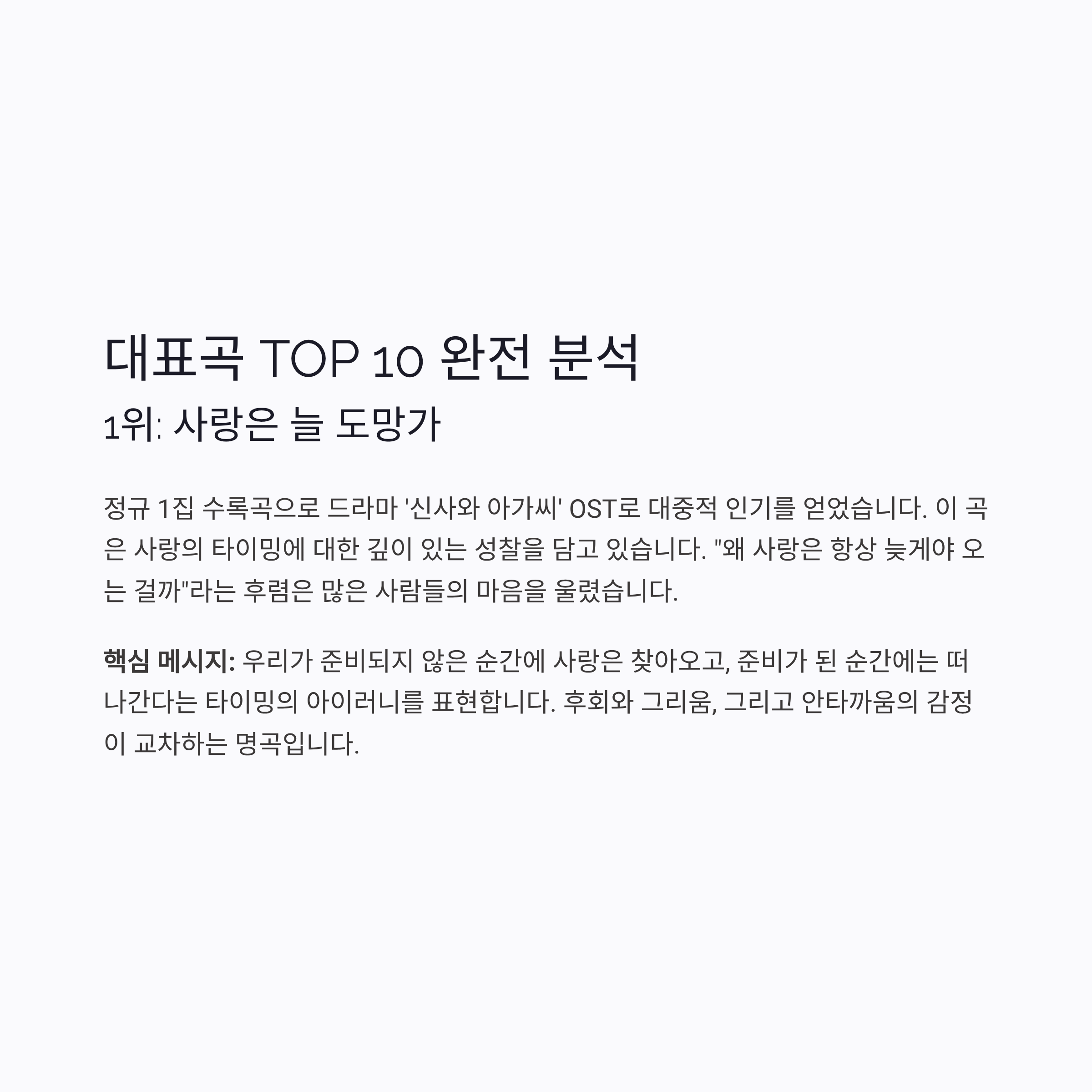 A7: 사랑, 이별, 인생의 의미가 가장 자주 다뤄집니다. 특히 "순간의 소중함"과 "타이밍의 중요성"이 그의 음악 철학의 핵심입니다.