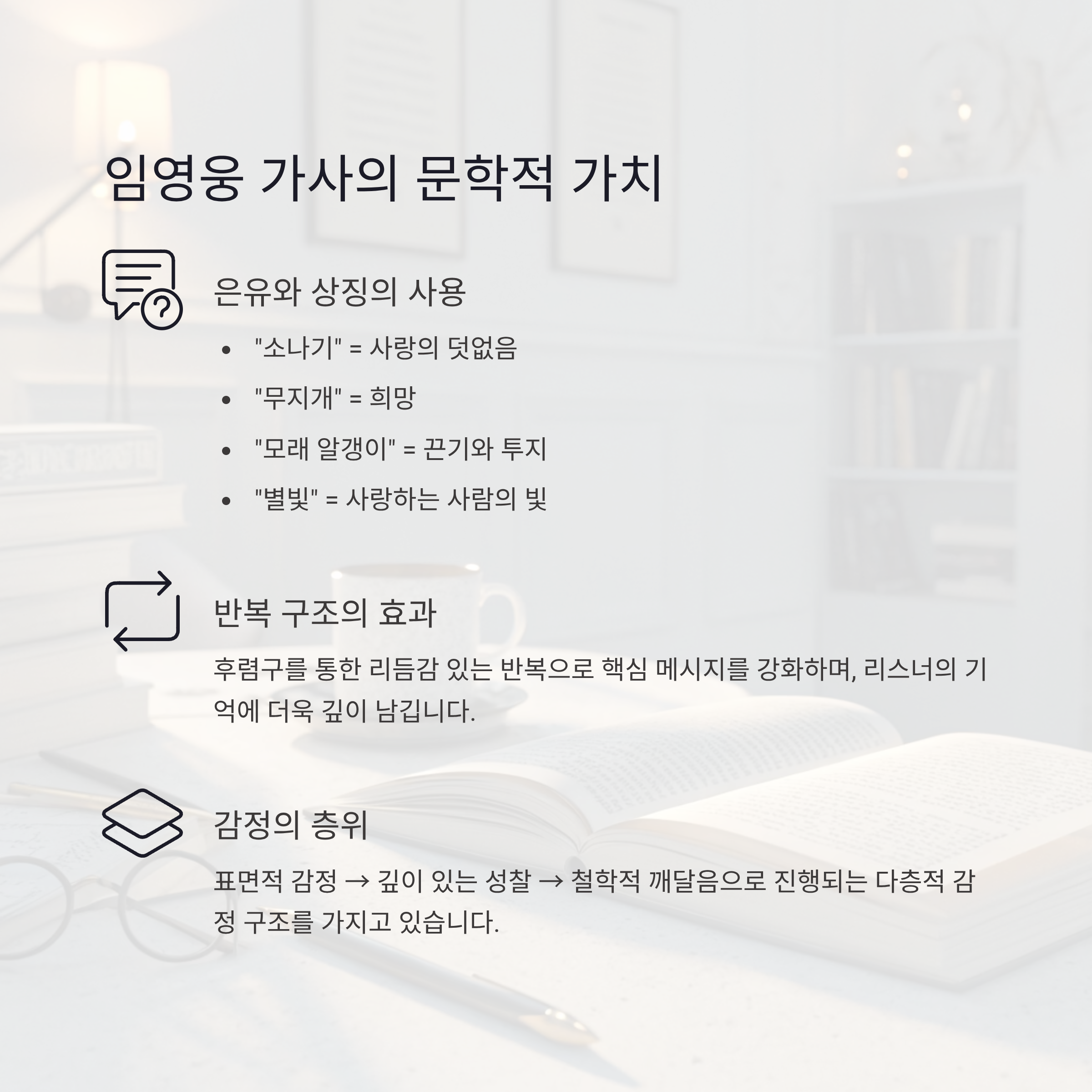 "지금보다 더 찬란하게 빛나길"이라는 가사에는 임영웅의 따뜻한 마음이 녹아 있습니다. 비가 온 후 무지개가 나타나는 자연의 현상을 인생에 비유한 이 곡은, 어두운 시절 후에 반드시 밝은 날이 올 것이라는 희망의 메시지를 전합니다.