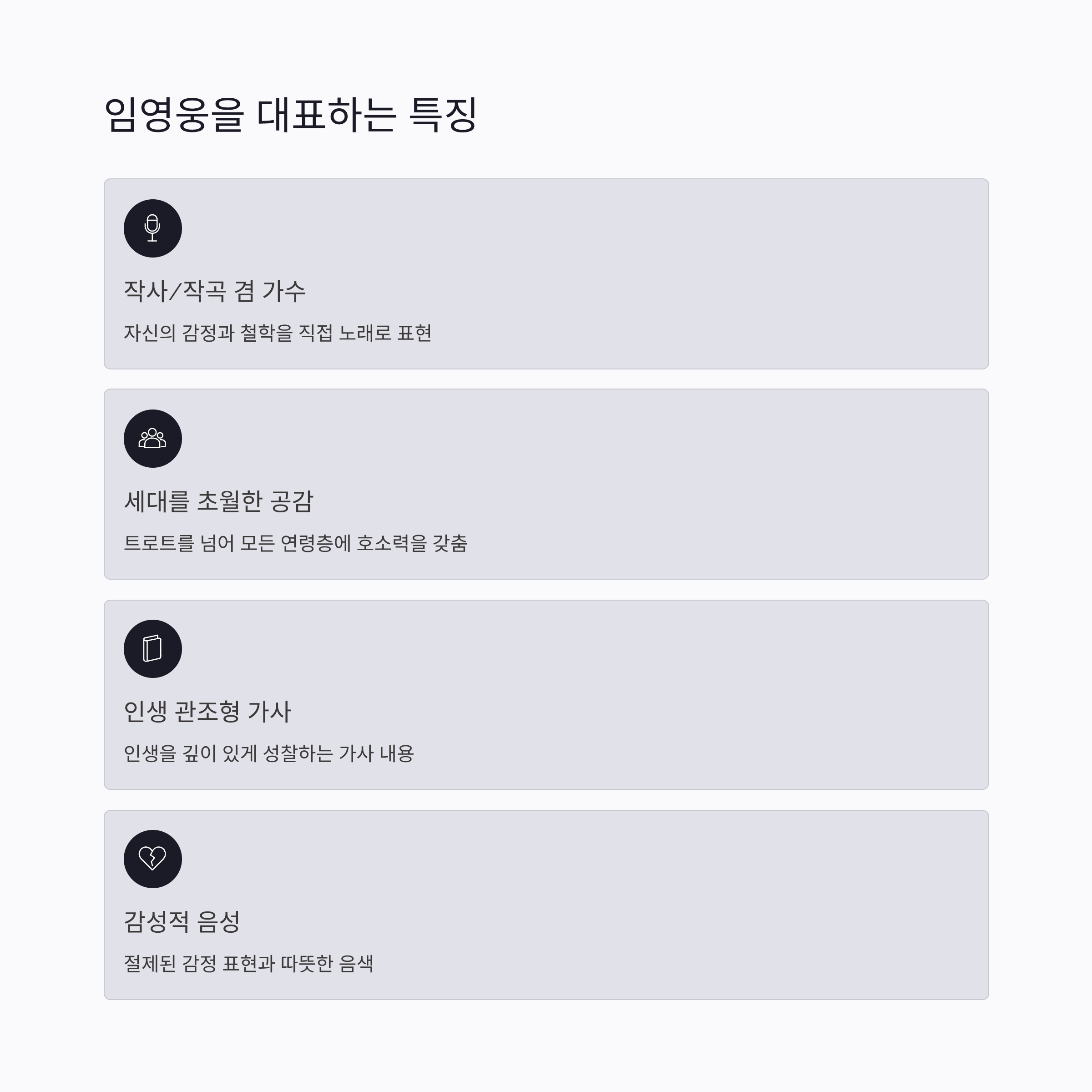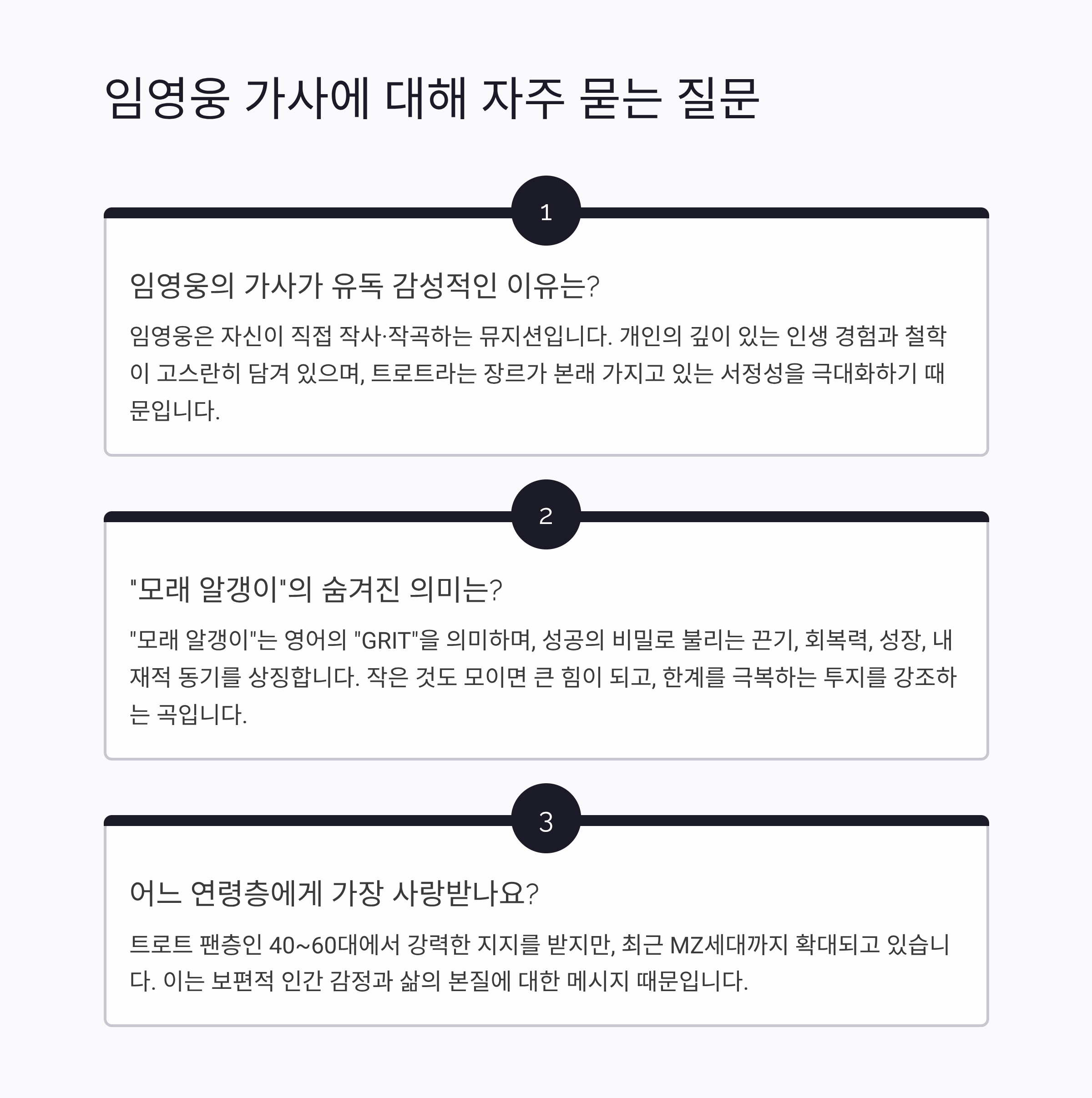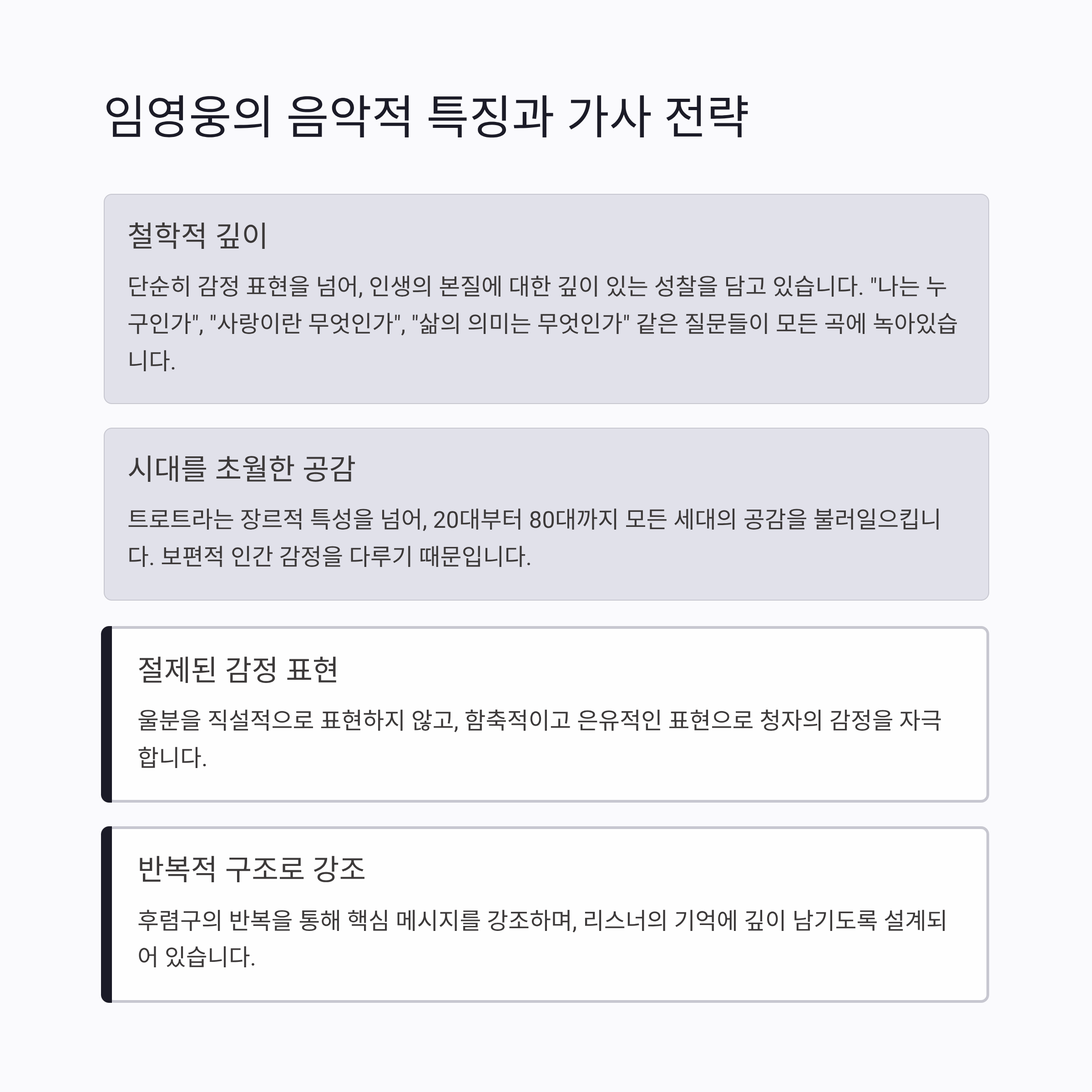 A1: 임영웅은 자신이 직접 작사·작곡하는 뮤지션입니다. 개인의 깊이 있는 인생 경험과 철학이 고스란히 담겨 있으며, 트로트라는 장르가 본래 가지고 있는 서정성을 극대화하기 때문입니다.