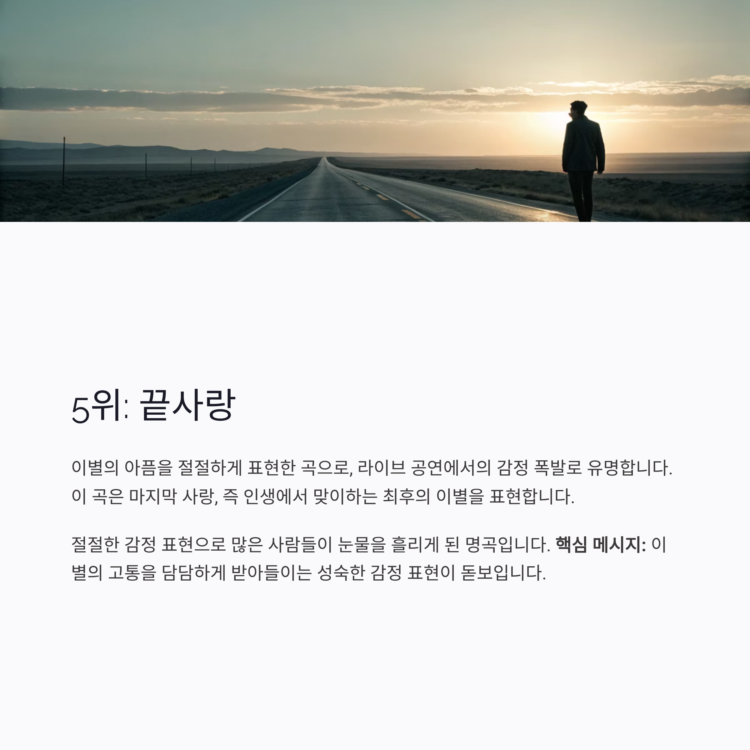 이 곡은 마지막 사랑, 즉 인생에서 맞이하는 최후의 이별을 표현합니다. 절절한 감정 표현으로 많은 사람들이 눈물을 흘리게 된 명곡입니다.