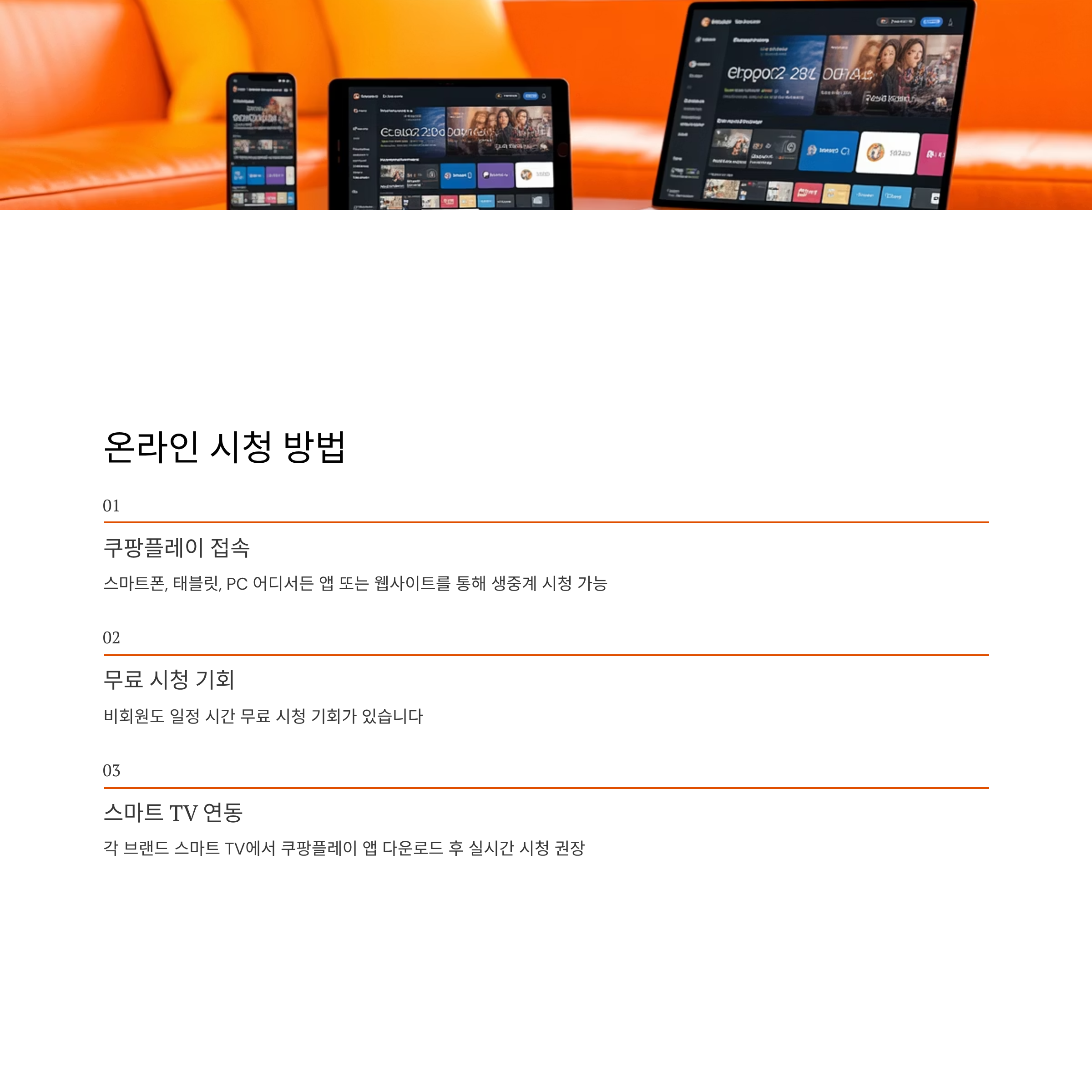 - 쿠팡플레이(OTT 플랫폼): 스마트폰, 태블릿, PC 어디서든 앱 또는 웹사이트를 통해 생중계 시청 가능하며, 비회원도 일정 시간 무료 시청 기회가 있습니다.
