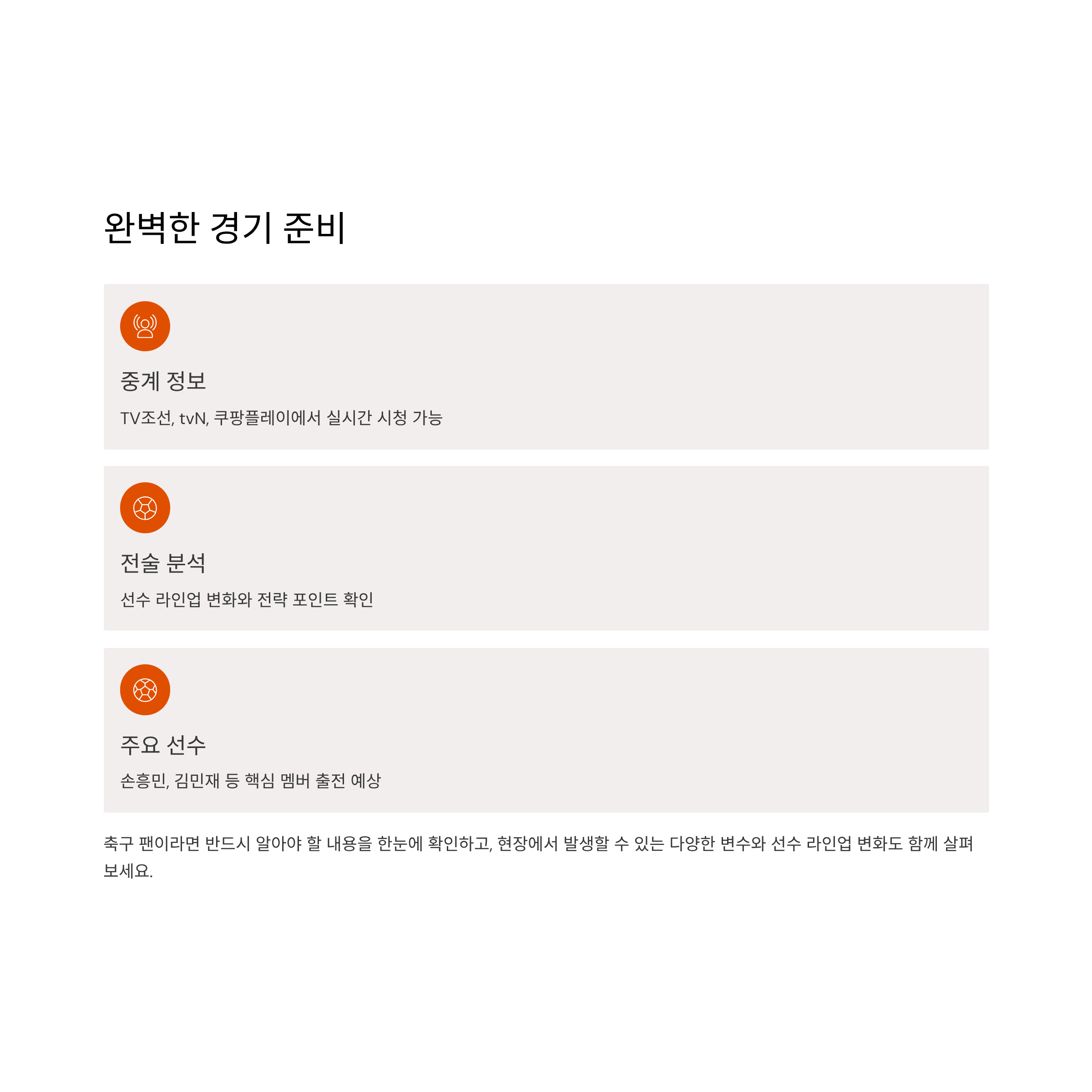 본문에서는 경기 중계 채널과 시청 방법, 경기 전반의 주요 이슈 및 선수단 정보, 그리고 경기 관전 포인트까지 상세히 안내해드립니다.