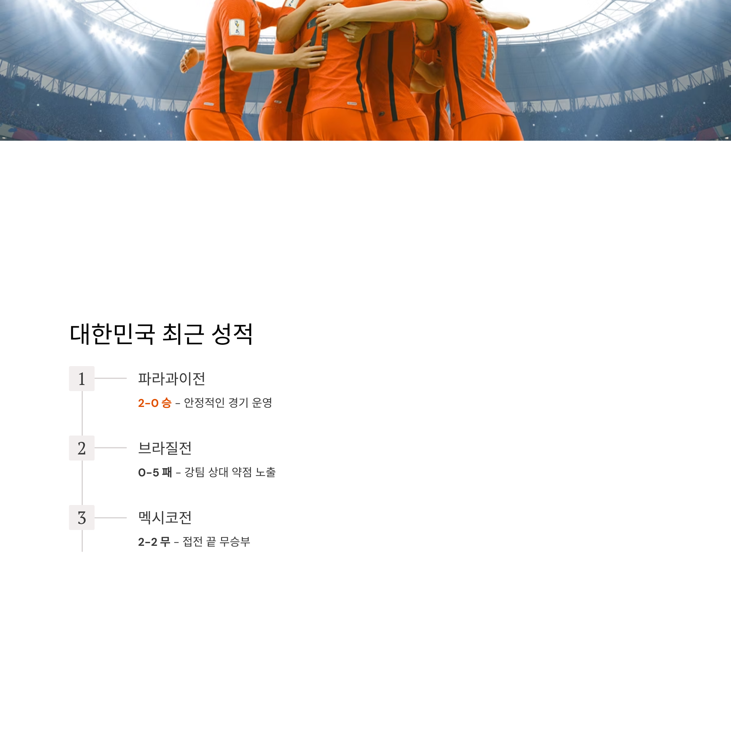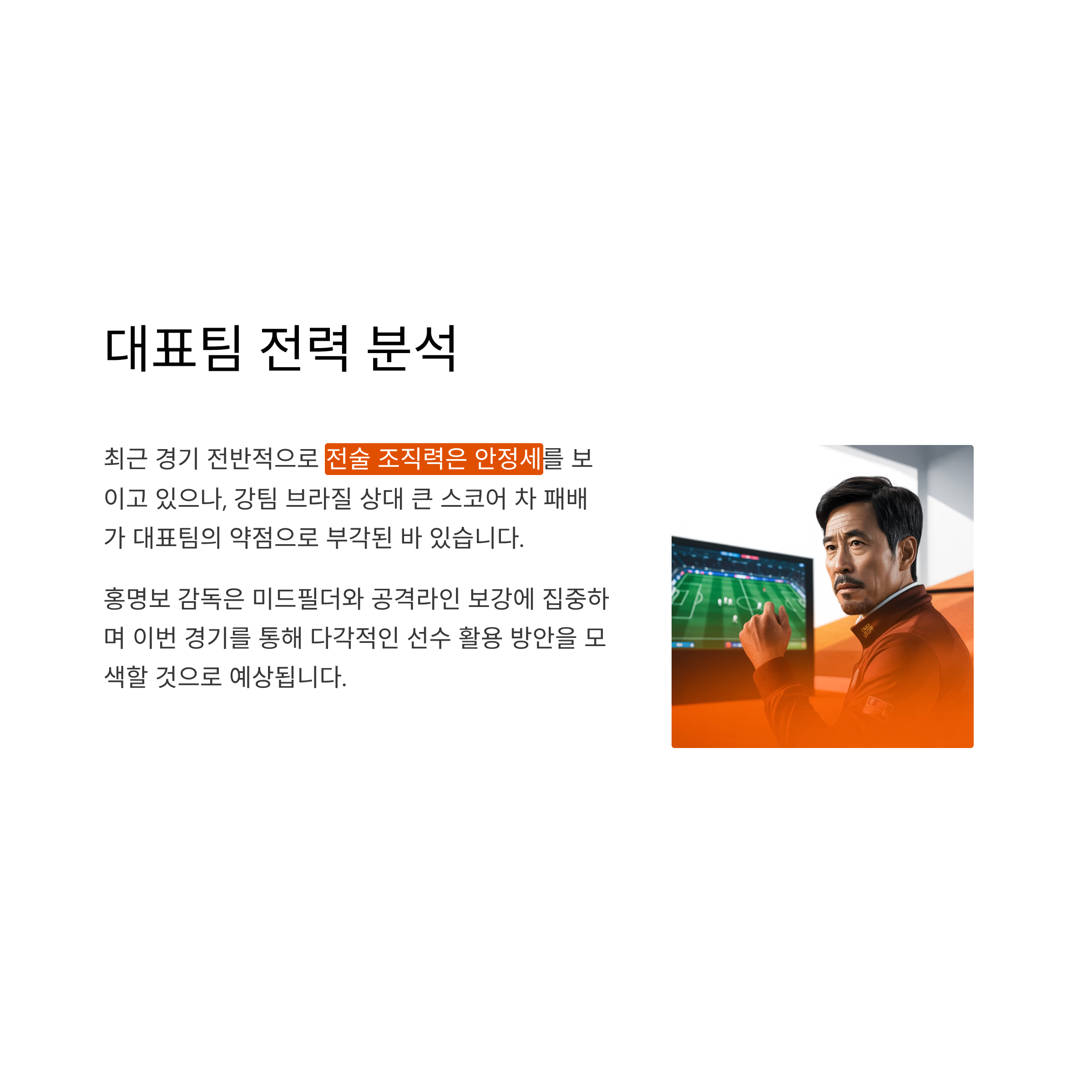 최근 경기 전반적으로 전술 조직력은 안정세를 보이고 있으나, 강팀 브라질 상대 큰 스코어 차 패배가 대표팀의 약점으로 부각된 바 있습니다.