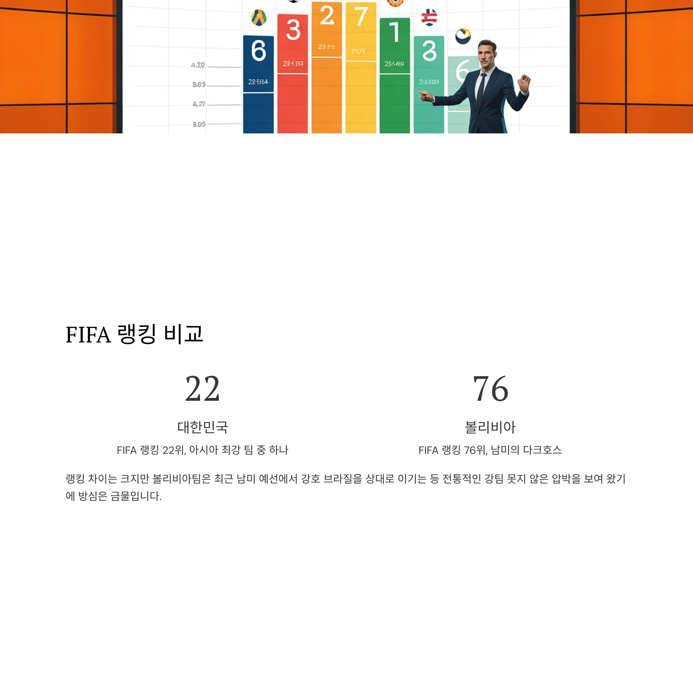 대한민국은 2025년 현재 FIFA 랭킹 22위이며, 상대 볼리비아는 76위로 다소 큰 랭킹 차이를 지니고 있습니다.