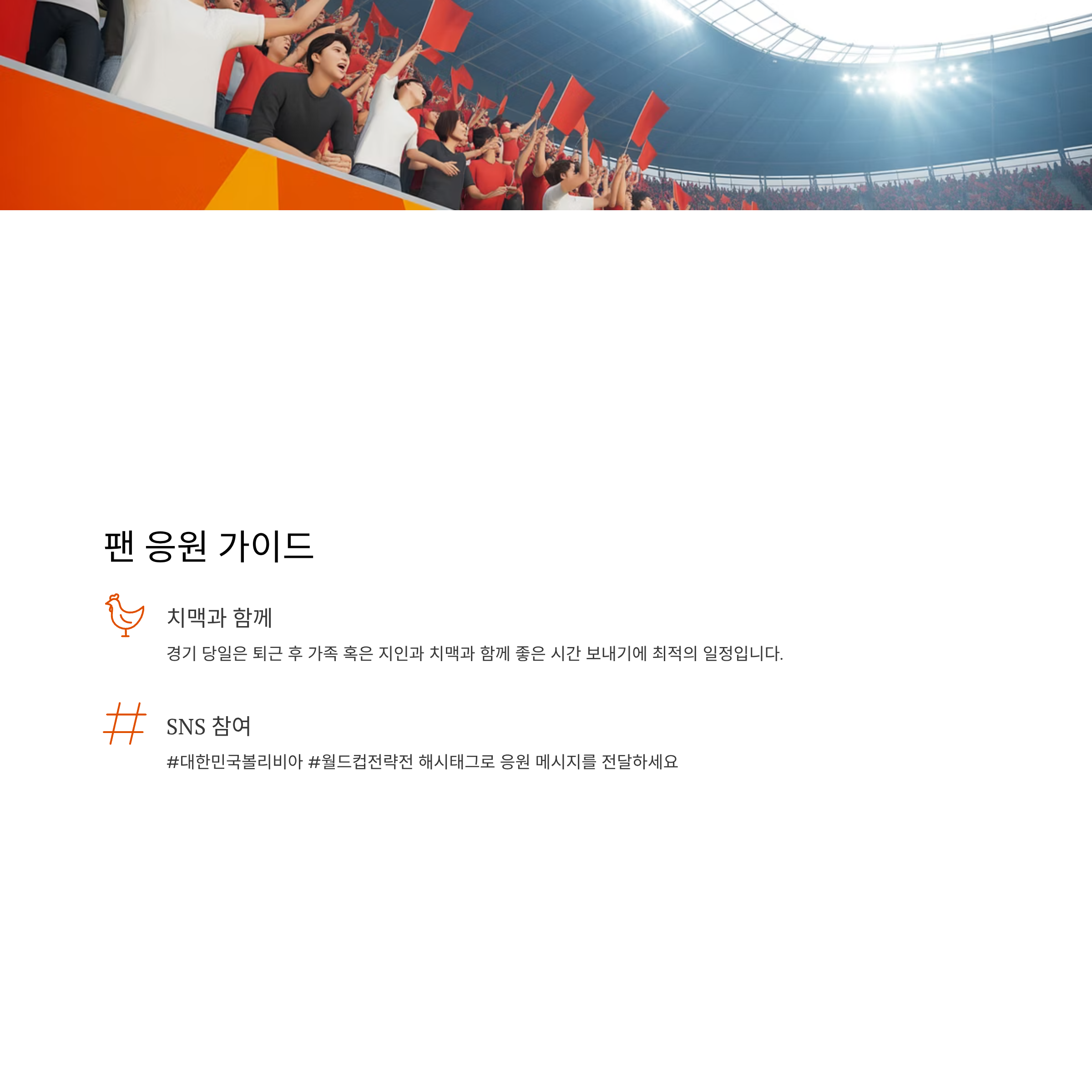 SNS 해시태그 #대한민국볼리비아 #월드컵전략전 공유를 통해 응원 메시지를 전달하고, 각종 팬 커뮤니티 이벤트에도 참여해 즐거움을 더할 수 있습니다.