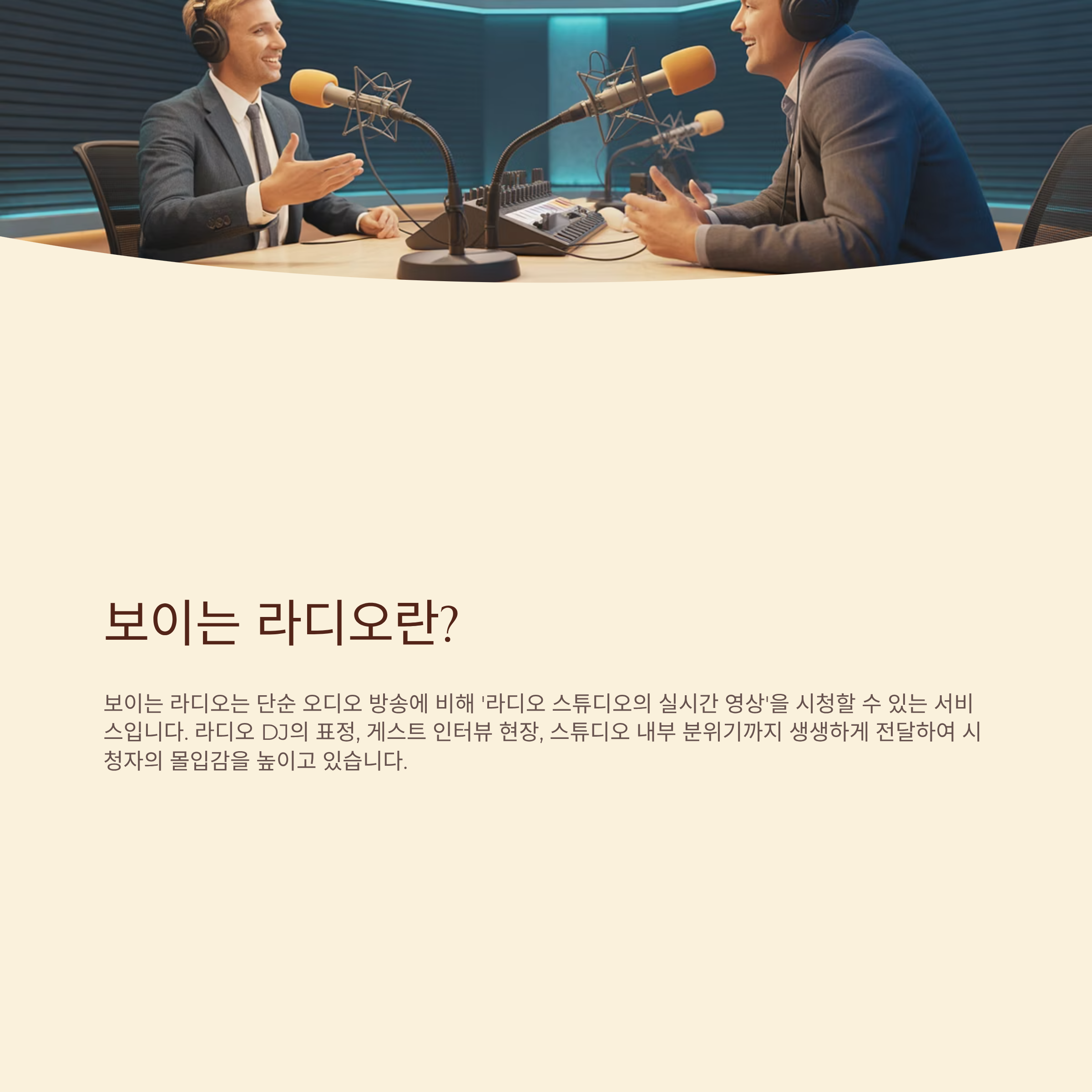 - 보이는 라디오 시청 시 스튜디오 모습에 집중하면 라디오 청취의 재미가 한층 배가됩니다.