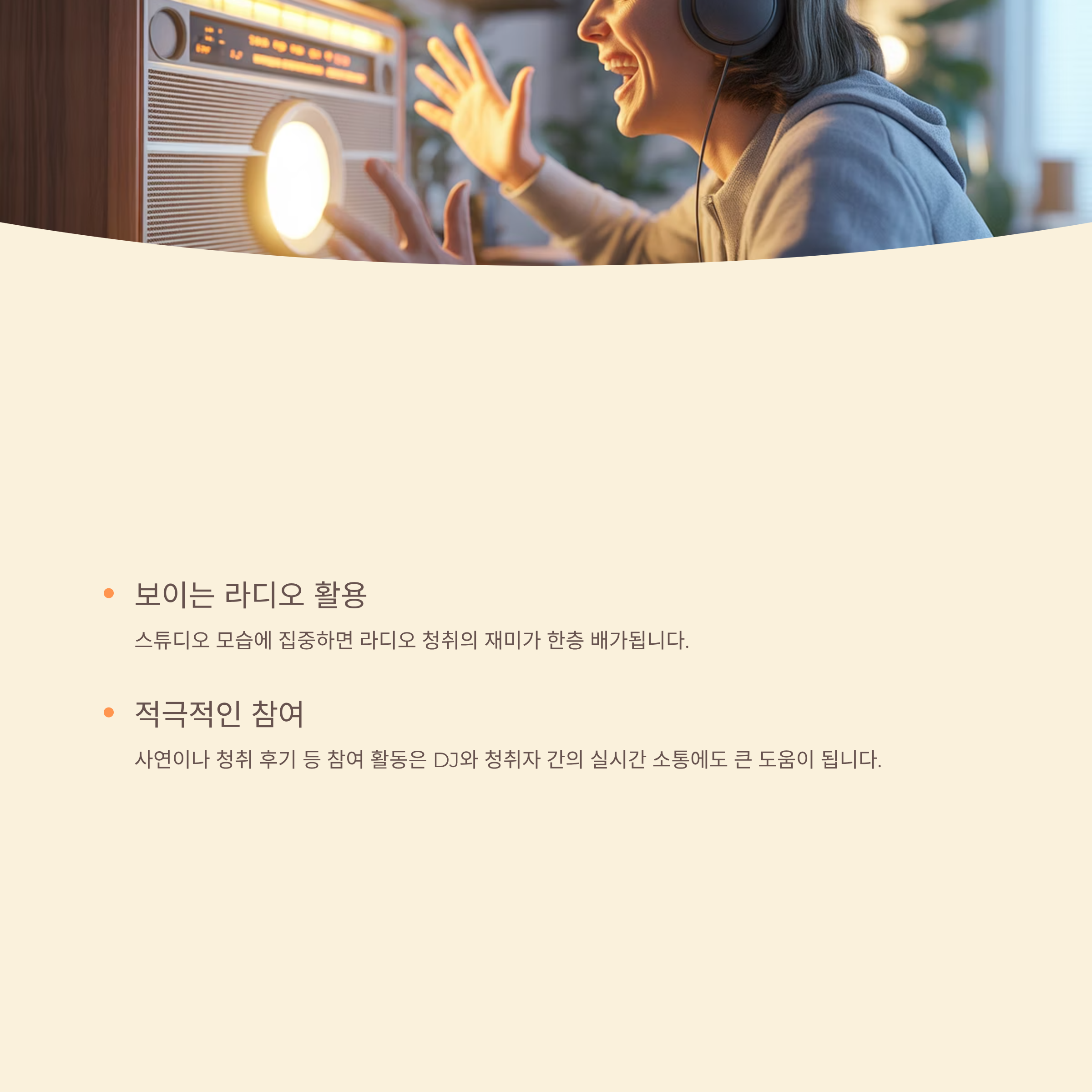 - 사연이나 청취 후기 등 참여 활동은 DJ와 청취자 간의 실시간 소통에도 큰 도움이 됩니다.