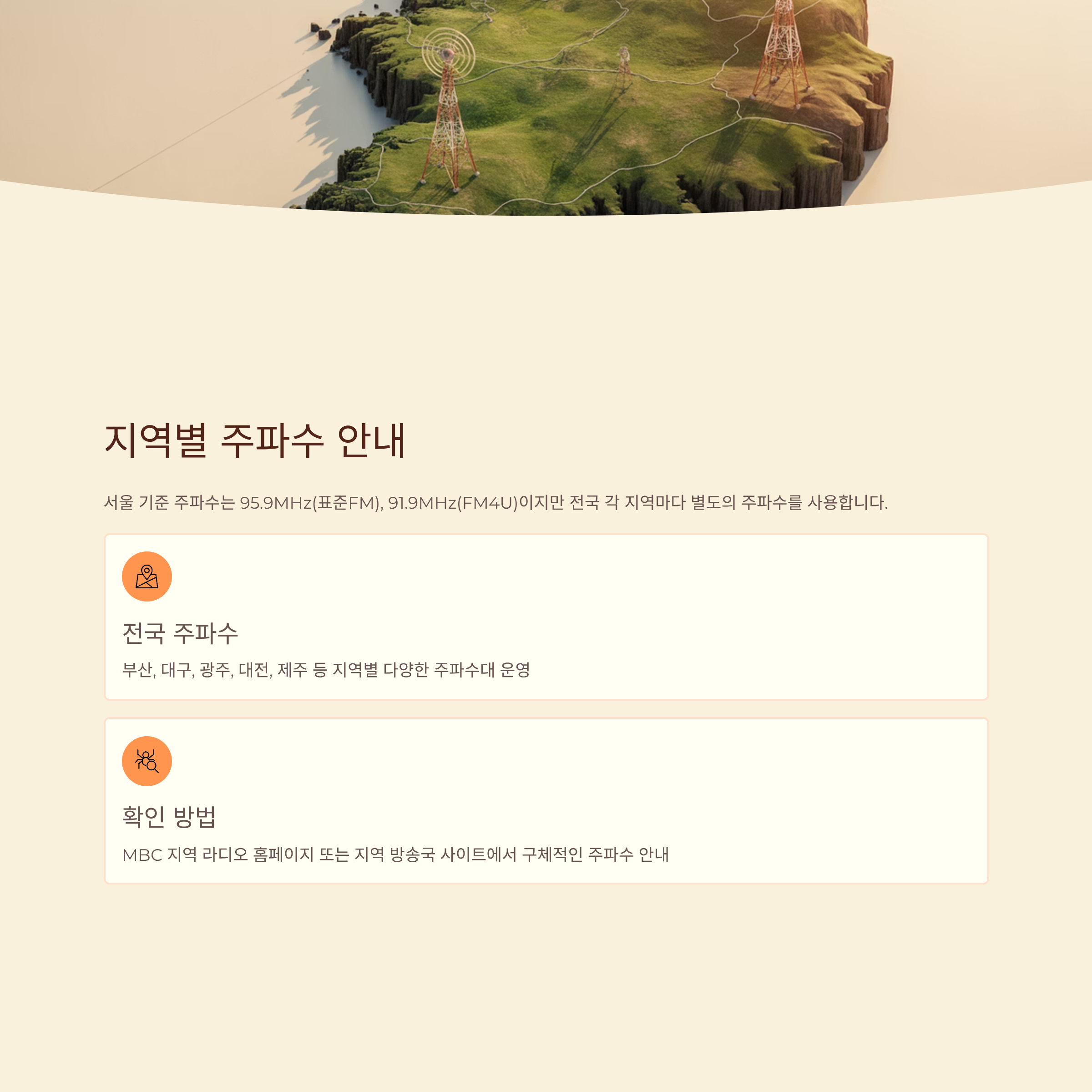 서울 기준 주파수는 앞서 소개한 95.9MHz(표준FM), 91.9MHz(FM4U)이지만 전국 각 지역마다 별도의 주파수를 사용합니다. 지역별로는 부산, 대구, 광주, 대전, 제주 등등 다양한 주파수대가 있으며, MBC 지역 라디오 홈페이지 또는 지역 방송국 사이트에서 구체적인 주파수를 안내받을 수 있습니다.