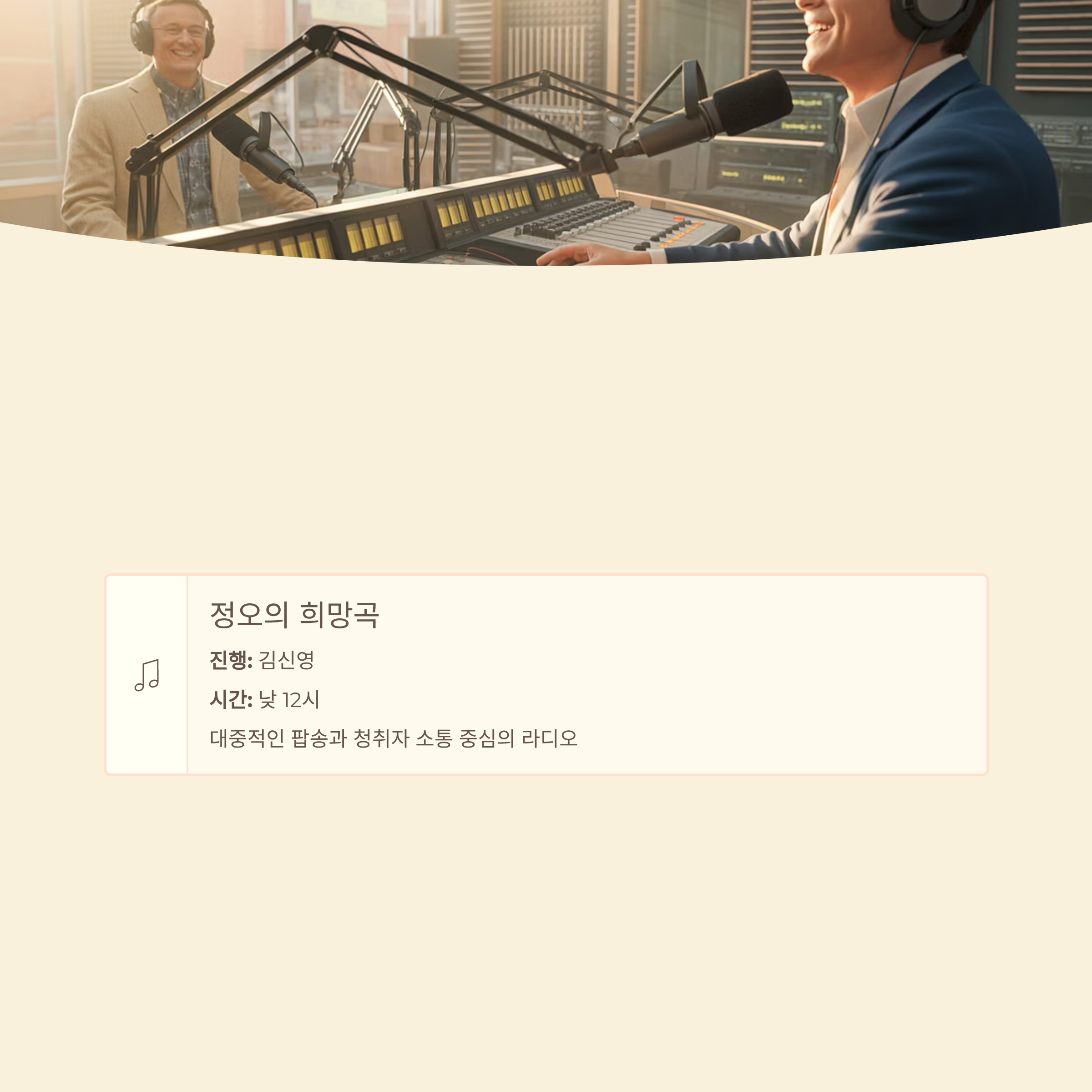 - 정오의 희망곡 (김신영 진행): 낮 12시부터 시작, 대중적인 팝송과 청취자 소통 중심의 라디오.