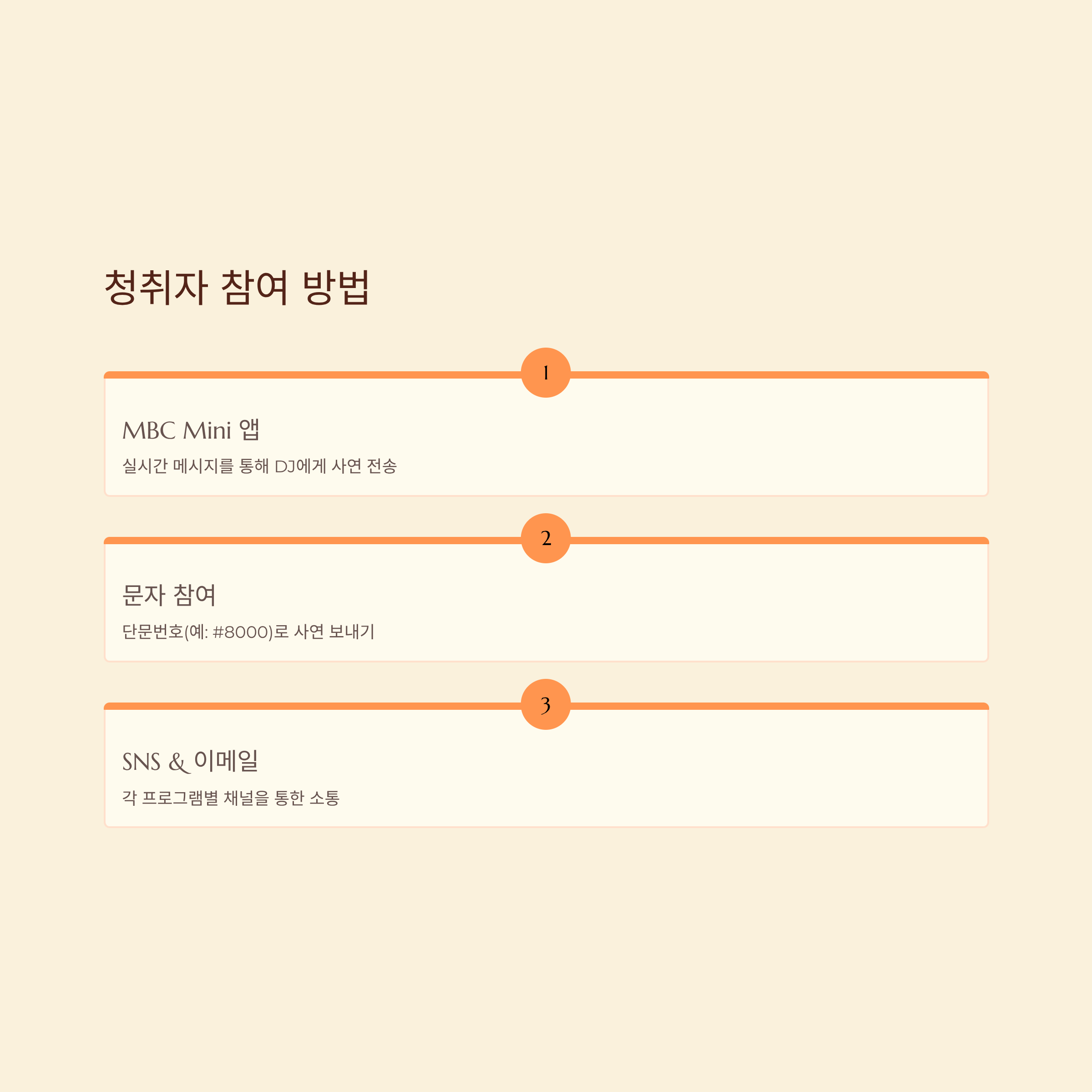 MBC Mini 앱에서는 실시간 메시지를 통해 DJ에게 사연을 보낼 수 있고, 안내되는 단문번호(예: #8000) 문자로도 참여가 가능합니다. 또한, 각 프로그램별 SNS 채널과 이메일을 통해서도 쉽게 소통할 수 있습니다.