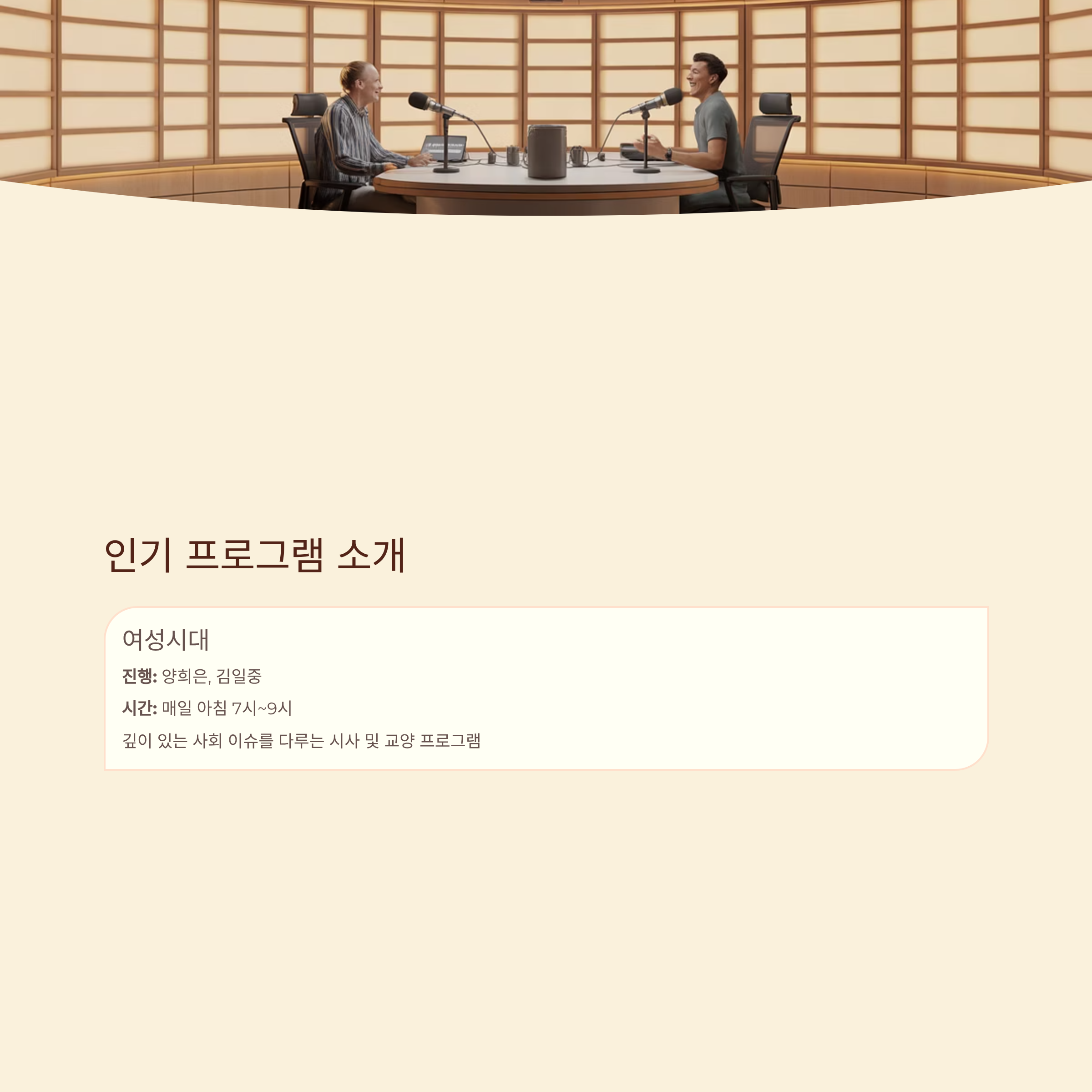 - 여성시대 (양희은, 김일중): 매일 아침 7시부터 9시까지 진행되는 시사 및 교양 프로그램. 깊이 있는 사회 이슈를 다룹니다.