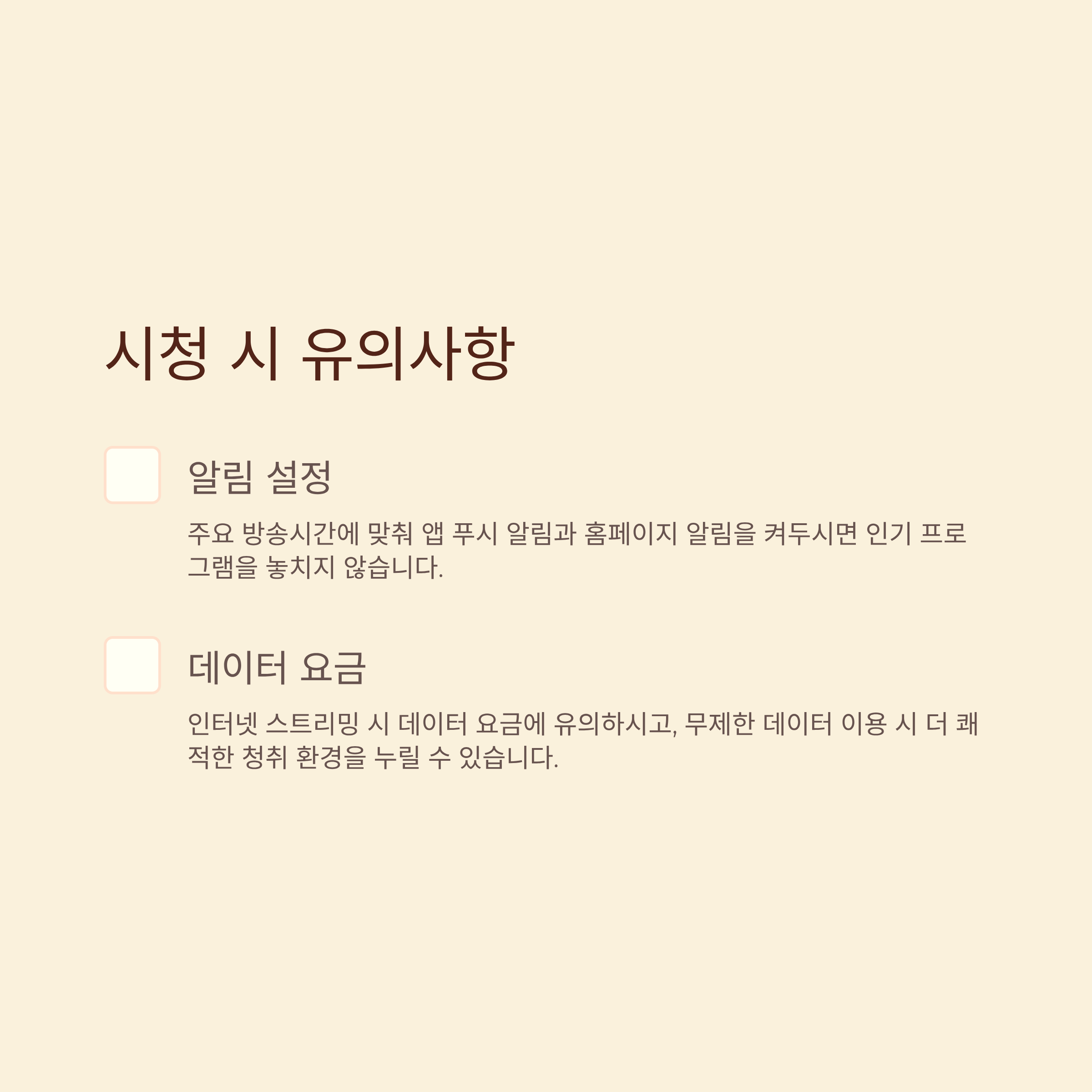 - 주요 방송시간에 맞춰 앱 푸시 알림과 홈페이지 알림을 켜두시면 인기 프로그램을 놓치지 않습니다.