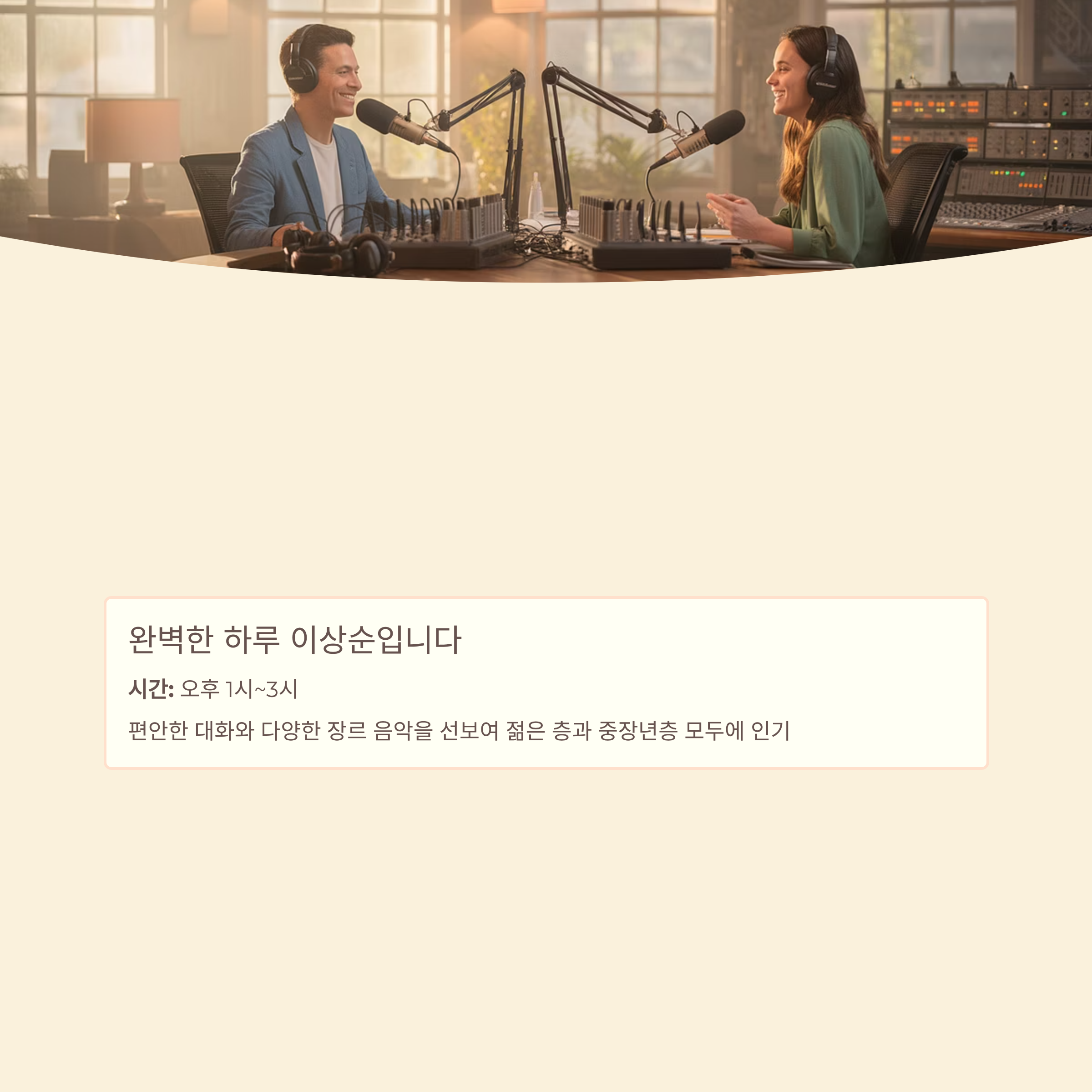 - 완벽한 하루 이상순입니다: 오후 1시부터 3시까지, 편안한 대화와 다양한 장르 음악을 선보여 젊은 층과 중장년층 모두에 인기가 많습니다.