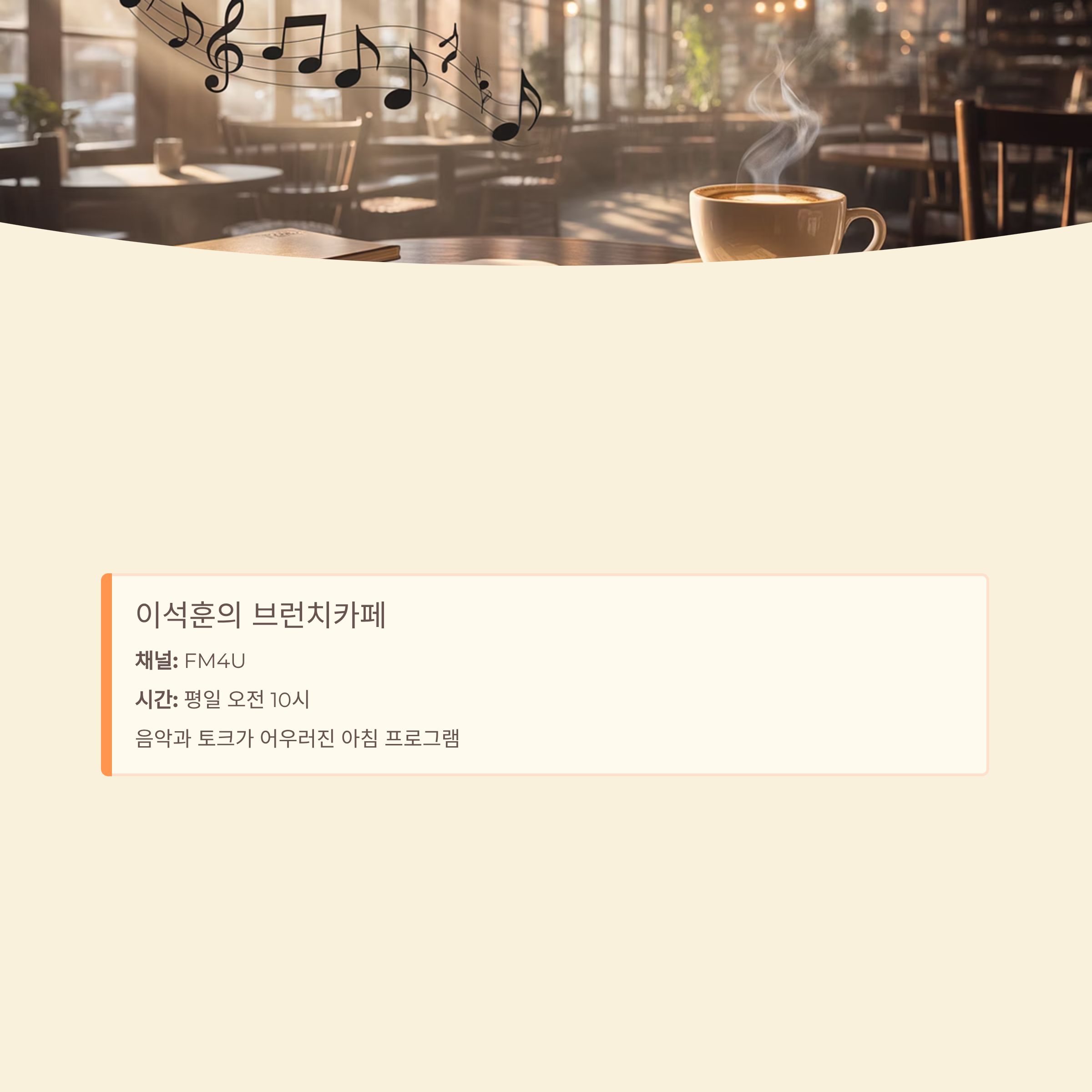 - 이석훈의 브런치카페: FM4U 채널에서 평일 10시에 시작하는 음악과 토크 프로그램.