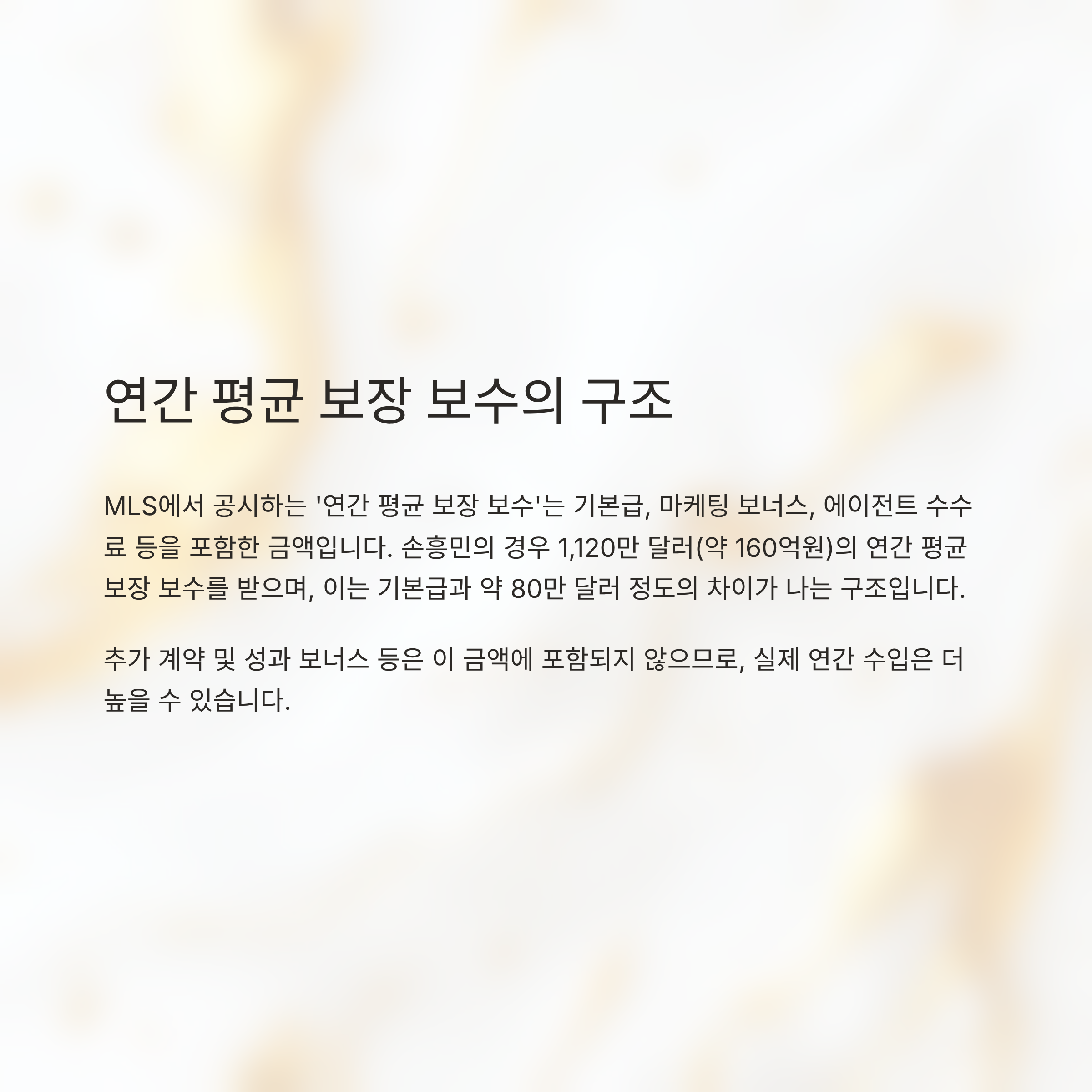 MLS에서 공시하는 '연간 평균 보장 보수'는 기본급, 마케팅 보너스, 에이전트 수수료 등을 포함한 금액입니다. 손흥민의 경우 1,120만 달러(약 160억원)의 연간 평균 보장 보수를 받으며, 이는 기본급과 약 80만 달러 정도의 차이가 나는 구조입니다. 다만 추가 계약 및 성과 보너스 등은 이 금액에 포함되지 않으므로, 실제 연간 수입은 더 높을 수 있습니다.
