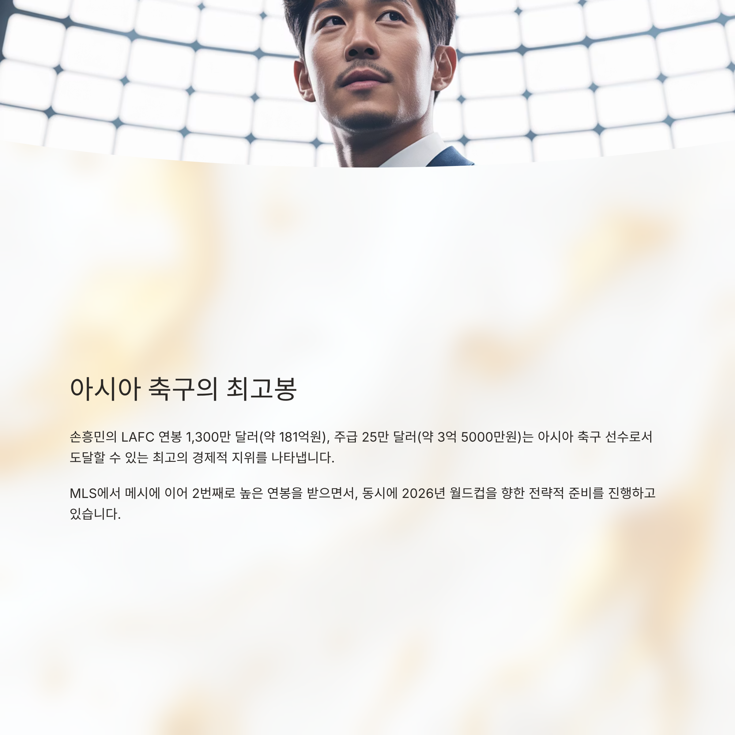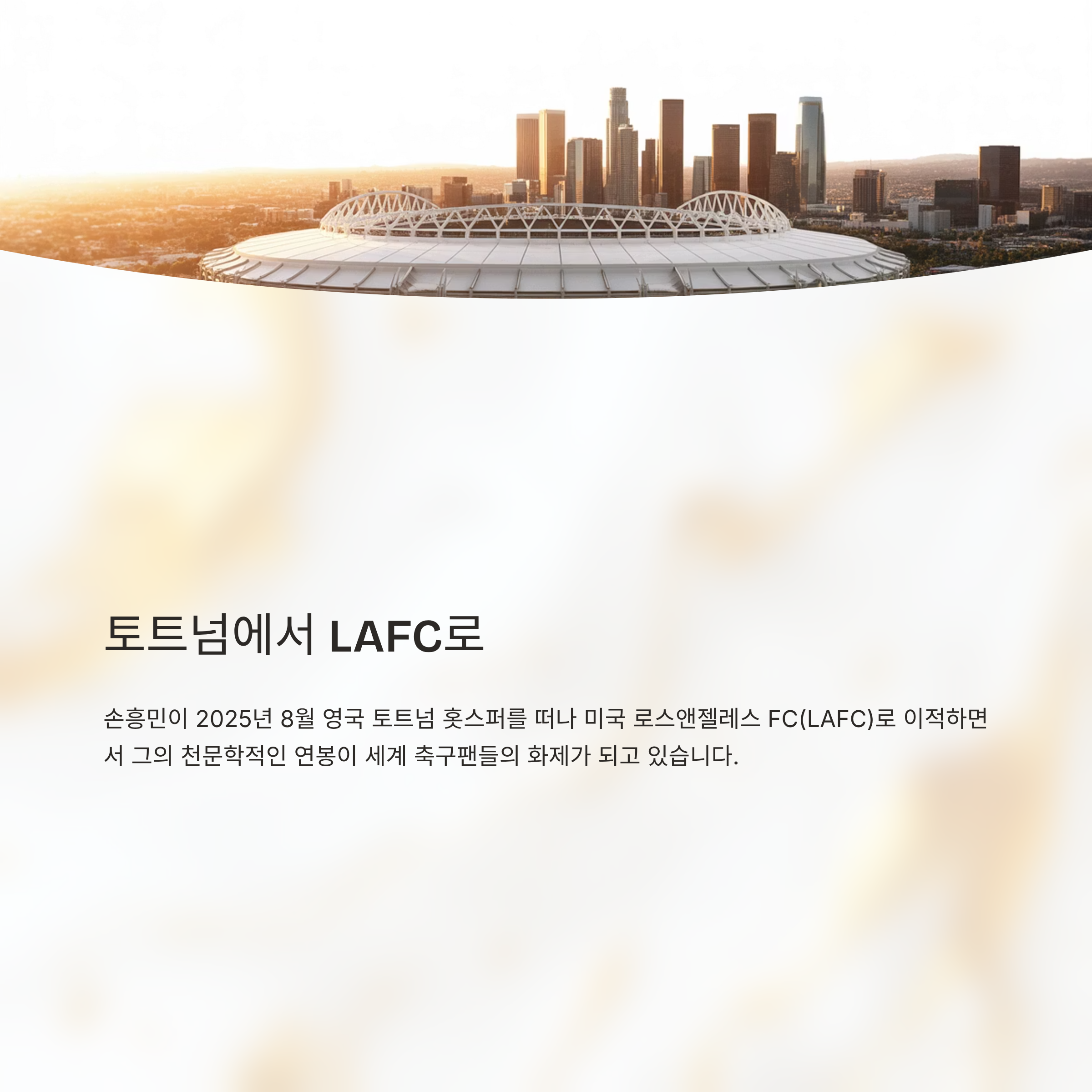 손흥민이 2025년 8월 영국 토트넘 홋스퍼를 떠나 미국 로스앤젤레스 FC(LAFC)로 이적하면서 그의 천문학적인 연봉이 세계 축구팬들의 화제가 되고 있습니다.