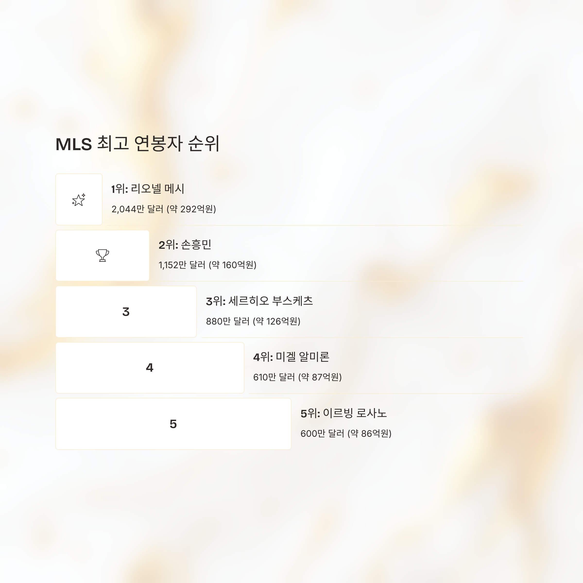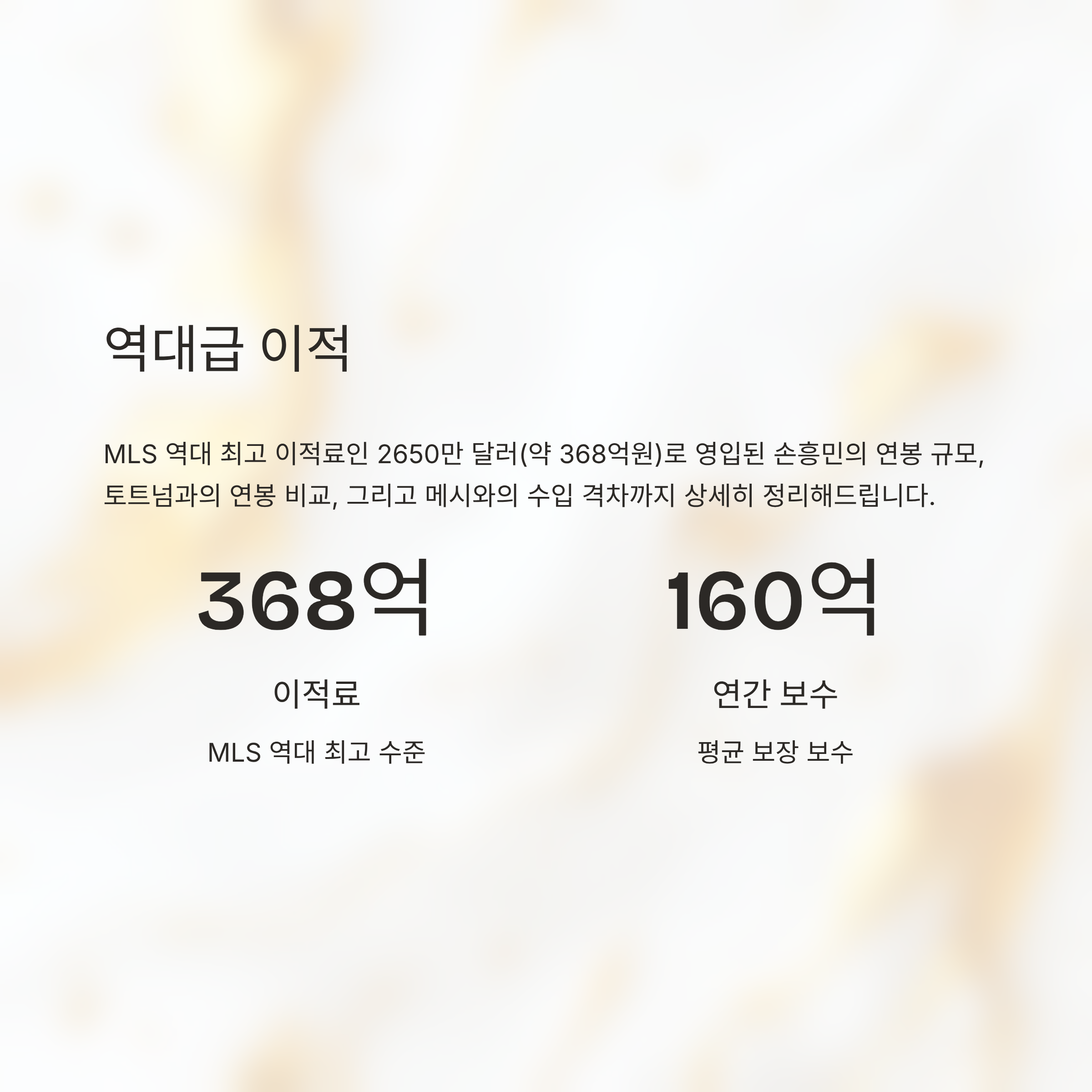 MLS 역대 최고 이적료인 2650만 달러(약 368억원)로 영입된 손흥민의 연봉 규모, 토트넘과의 연봉 비교, 그리고 메시와의 수입 격차까지 상세히 정리해드립니다.