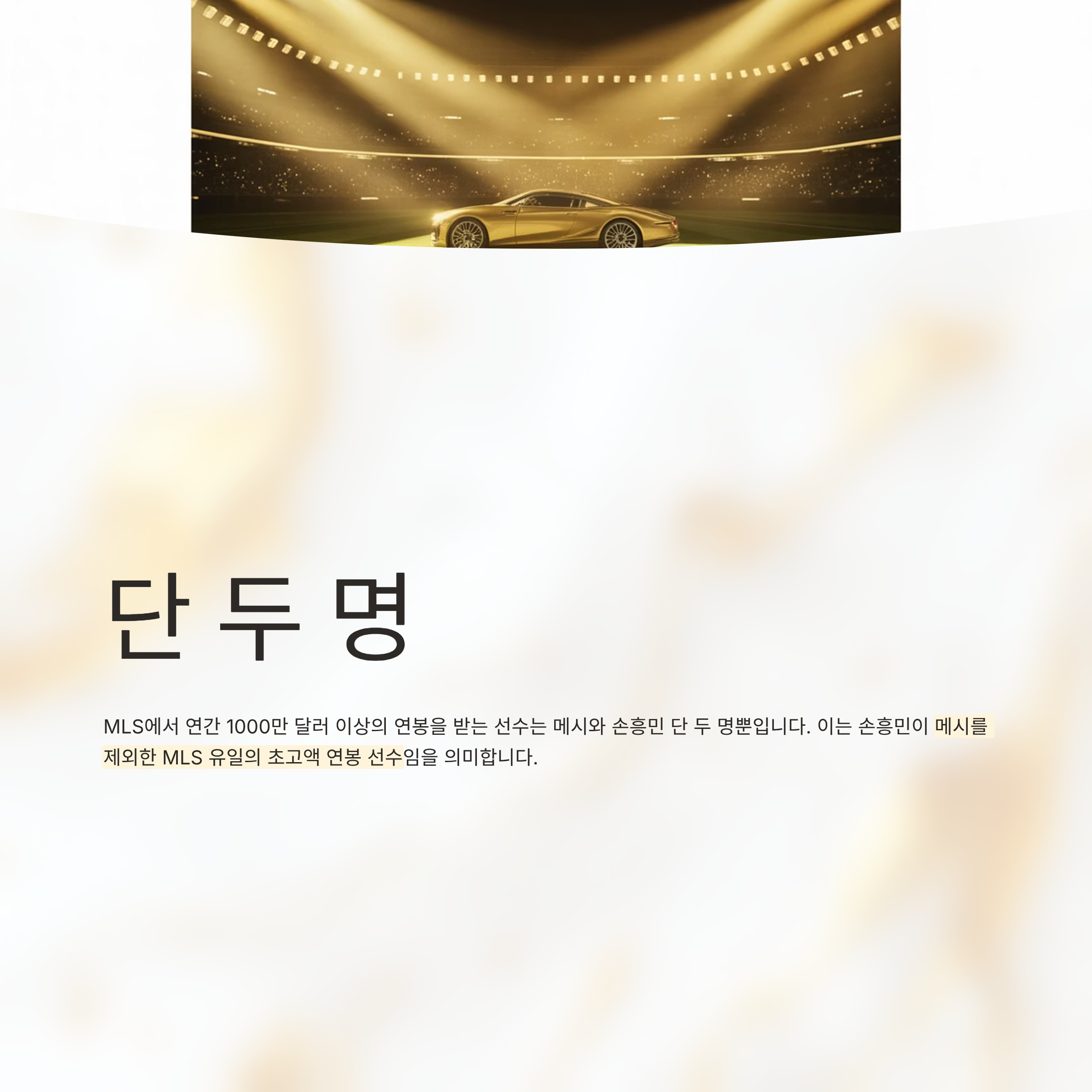 MLS에서 연간 1000만 달러 이상의 연봉을 받는 선수는 메시와 손흥민 단 두 명뿐입니다. 이는 손흥민이 **메시를 제외한 MLS 유일의 초고액 연봉 선수**임을 의미합니다.