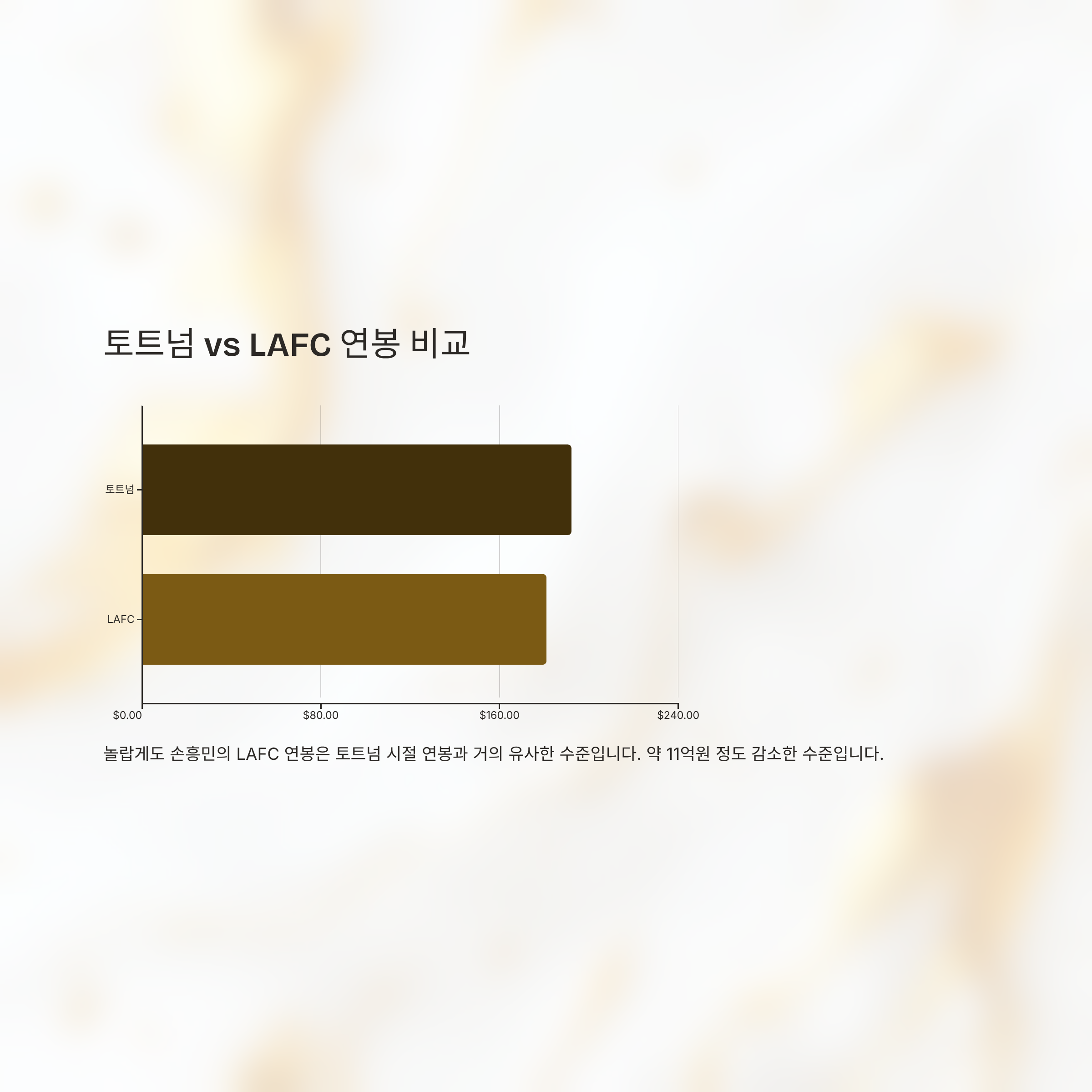 놀랍게도 손흥민의 LAFC 연봉은 토트넘 시절 연봉과 거의 유사한 수준입니다. 토트넘에서 약 192억원을 받았다면, LAFC에서는 약 181억원을 받고 있어 약 11억원 정도 감소한 수준입니다.