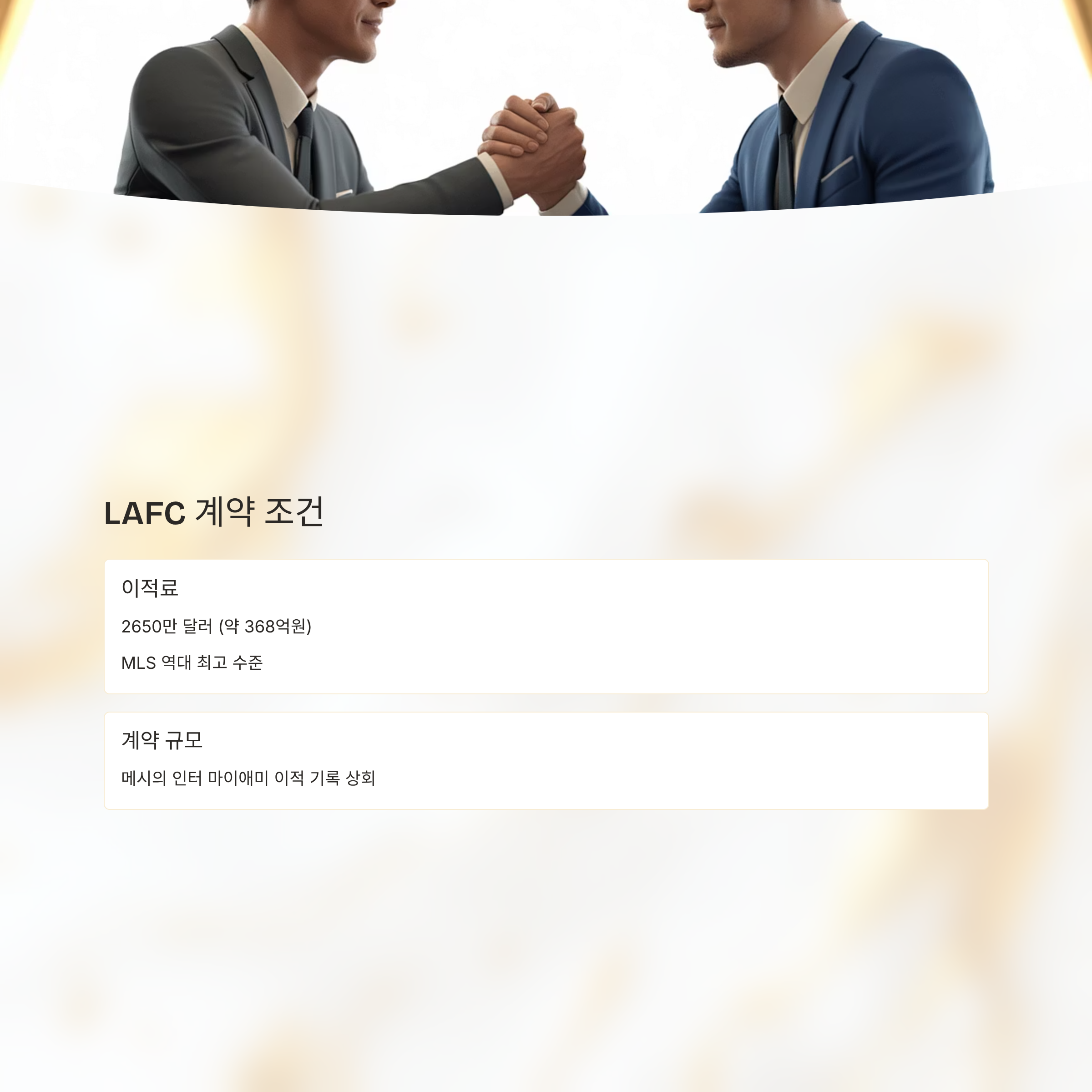 손흥민의 LAFC 이적료는 2650만 달러(약 368억원)로 MLS 역대 최고 수준입니다. 이는 메시가 인터 마이애미로 이적했을 당시 기록을 상회하는 규모입니다.