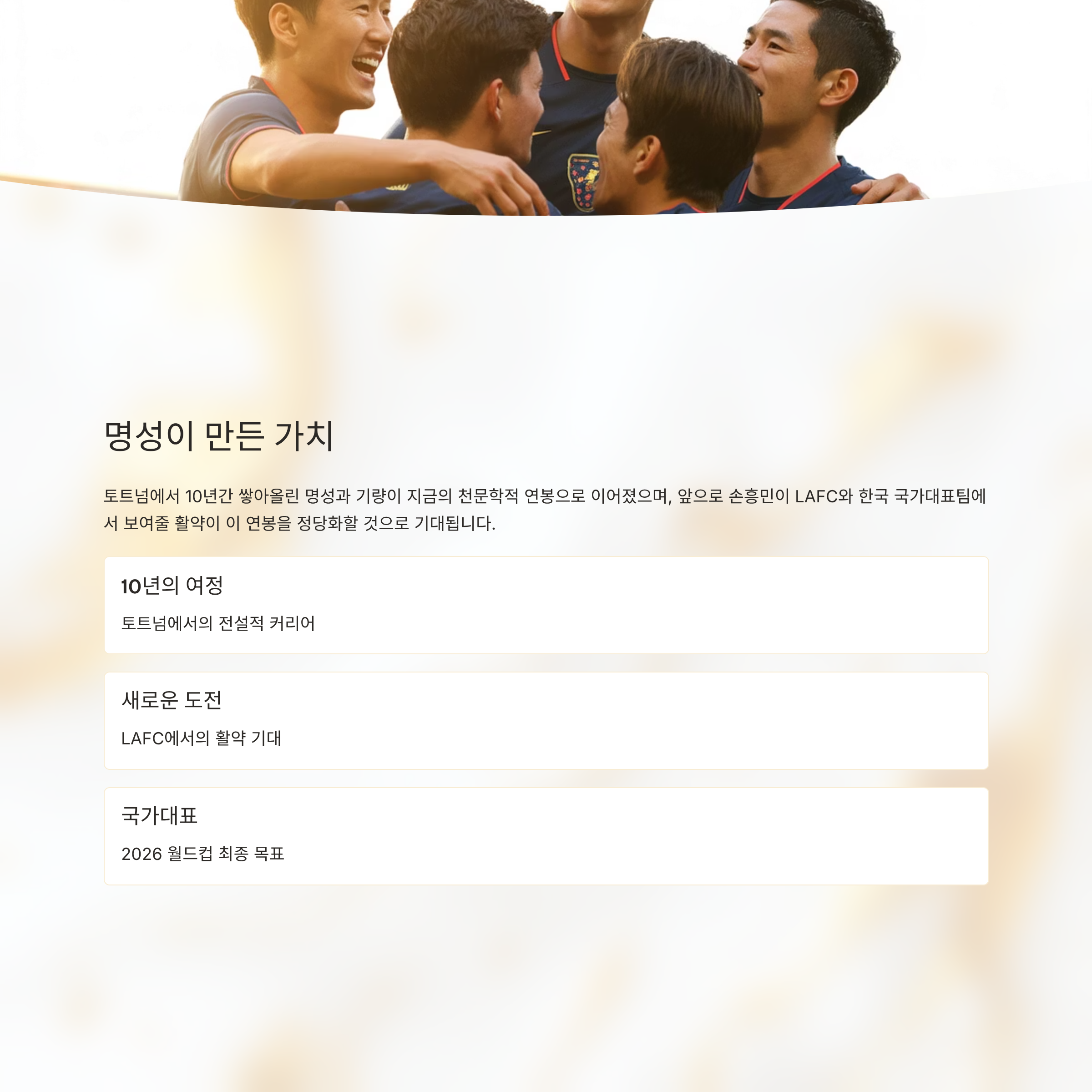 토트넘에서 10년간 쌓아올린 명성과 기량이 지금의 천문학적 연봉으로 이어졌으며, 앞으로 손흥민이 LAFC와 한국 국가대표팀에서 보여줄 활약이 이 연봉을 정당화할 것으로 기대됩니다.