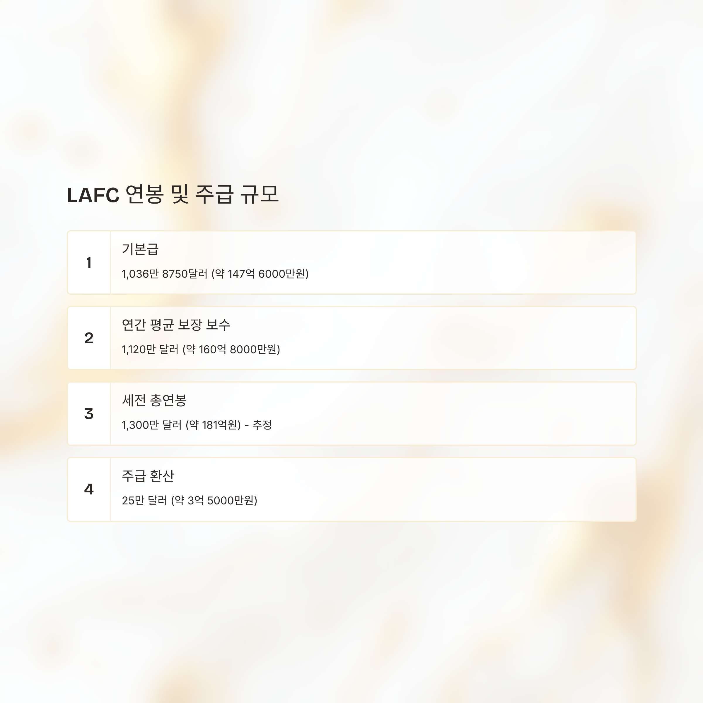 손흥민의 LAFC 세전 연봉은 공식적으로 확정되었으며, 그 규모는 다음과 같습니다.