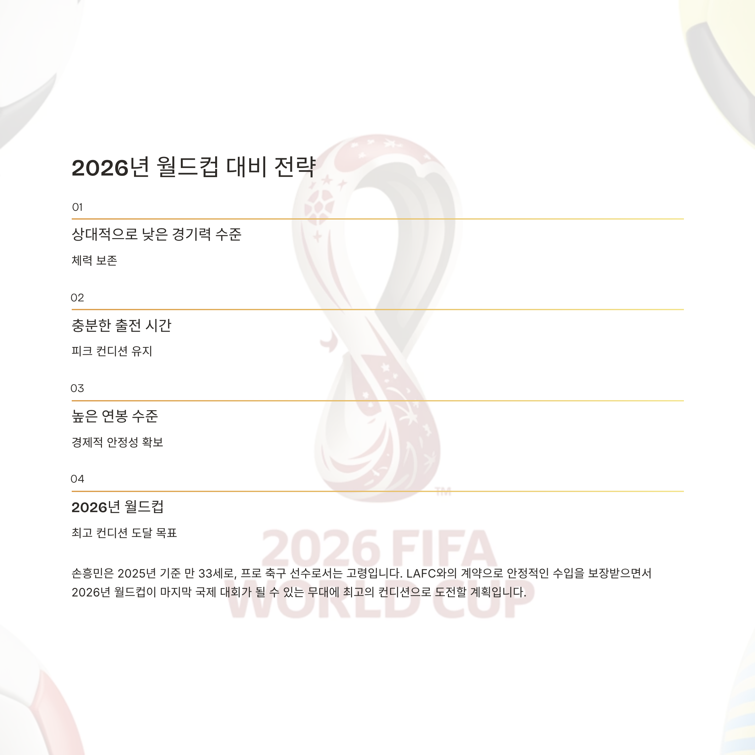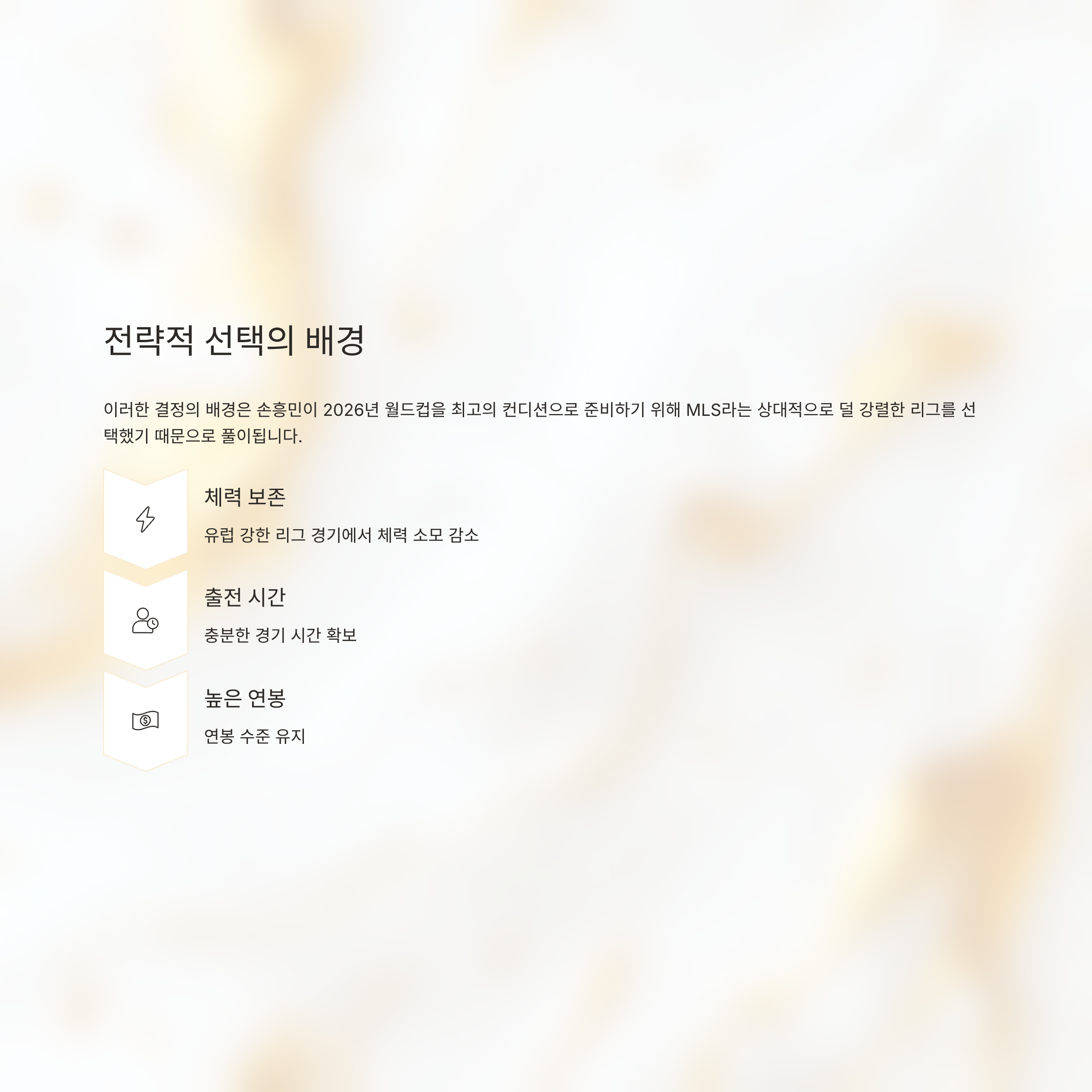 이러한 결정의 배경은 손흥민이 2026년 월드컵을 최고의 컨디션으로 준비하기 위해 MLS라는 상대적으로 덜 강렬한 리그를 선택했기 때문으로 풀이됩니다.
