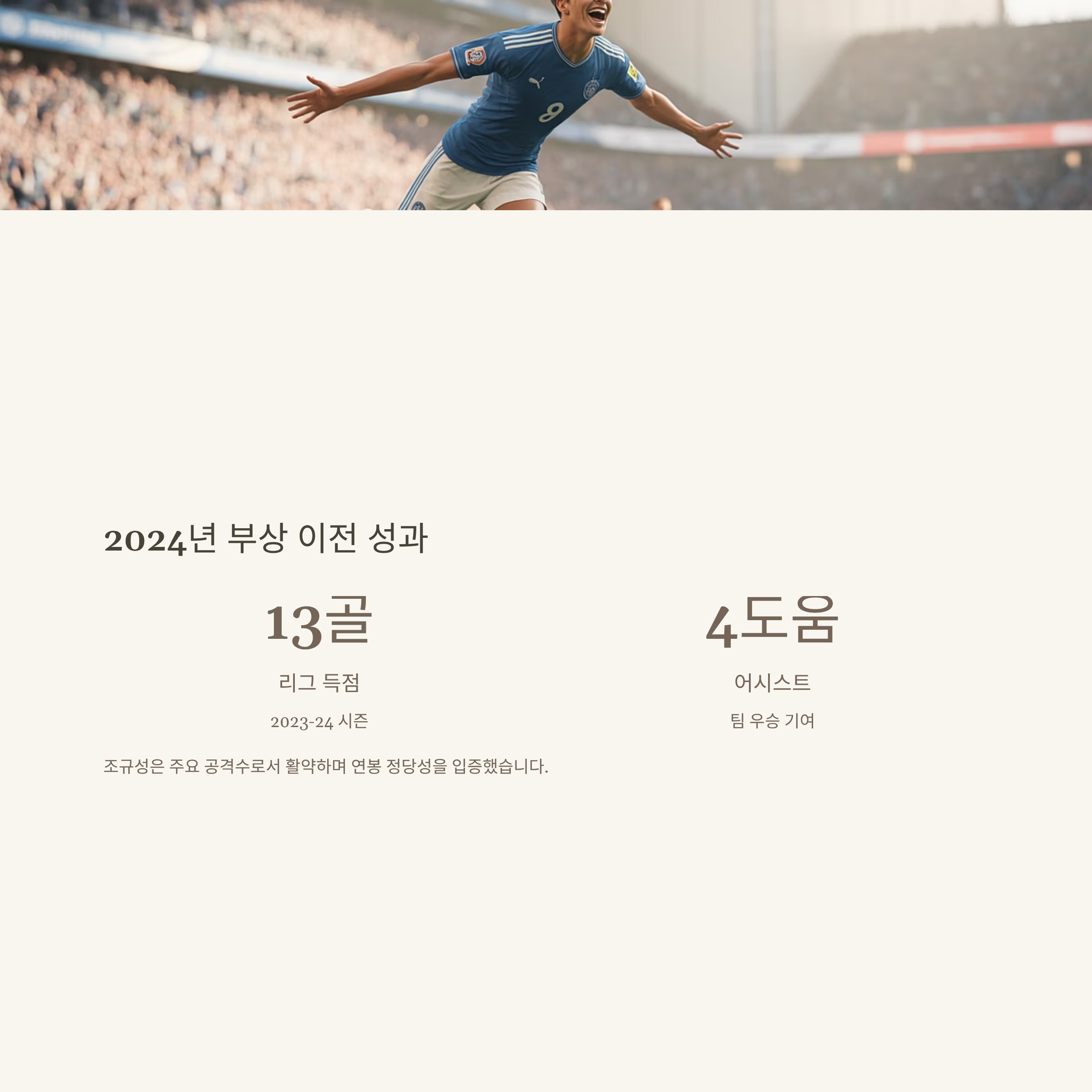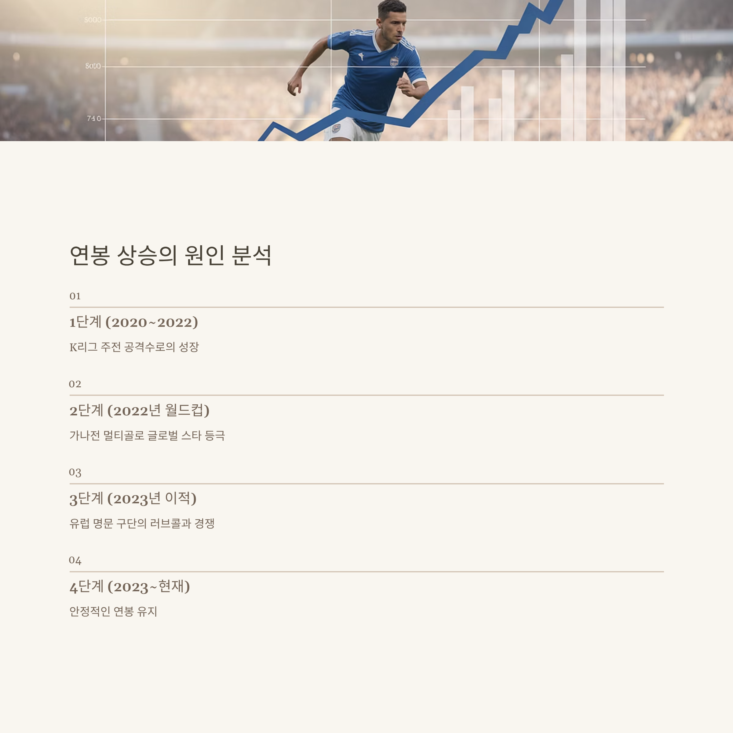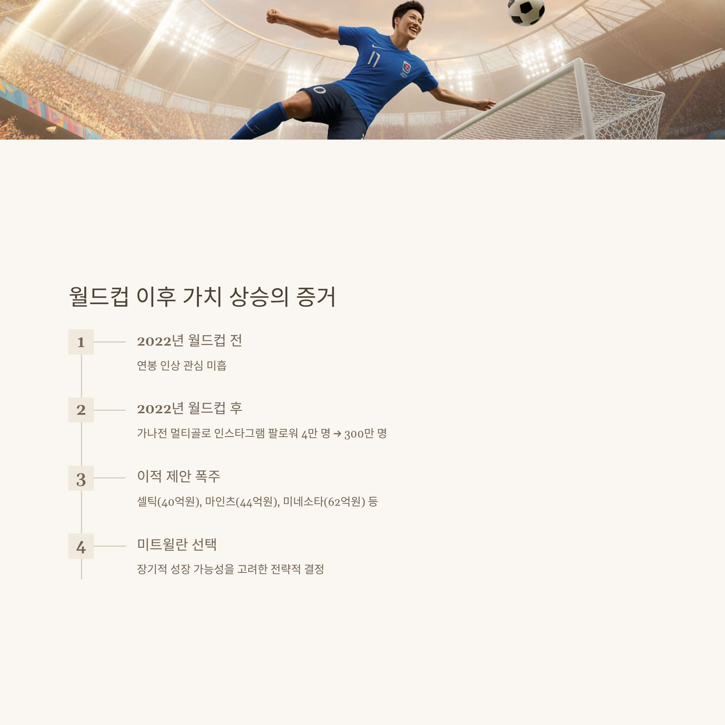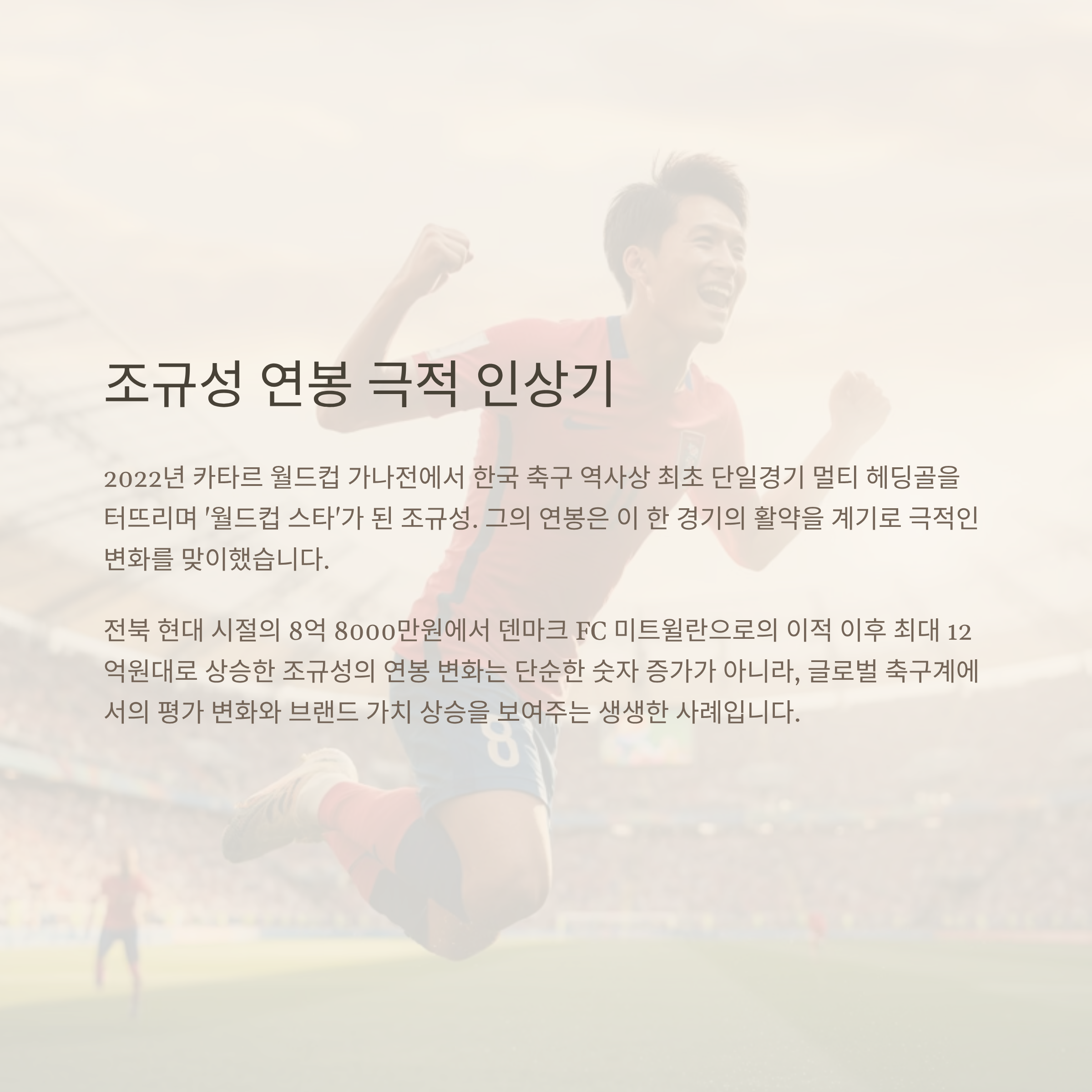 조규성의 연봉 변화는 단순한 숫자 상승이 아니라, 한 명의 축구 선수가 어떻게 글로벌 무대에서의 한 순간의 활약으로 인생이 바뀌는지를 보여주는 생생한 사례입니다.