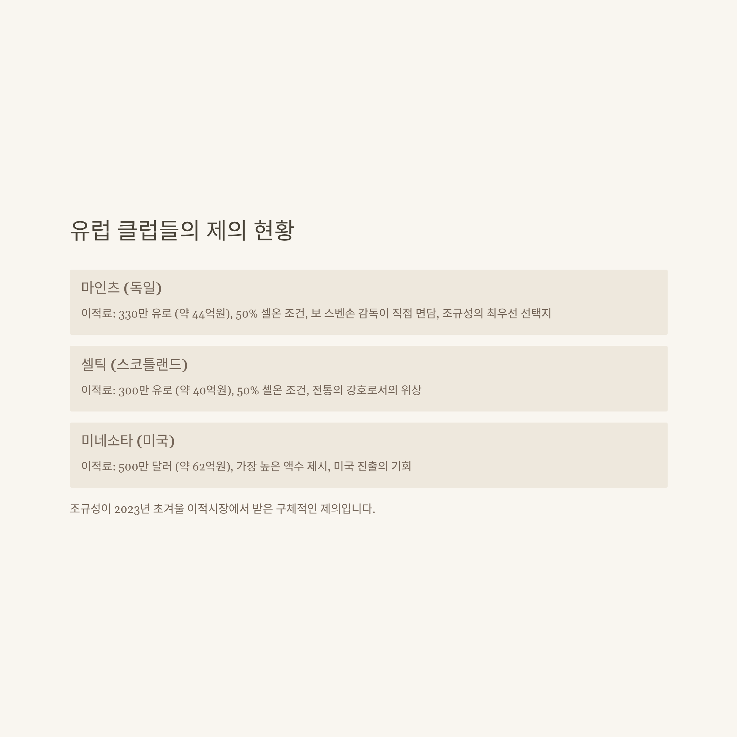 조규성이 2023년 초겨울 이적시장에서 받은 구체적인 제의는 다음과 같습니다.