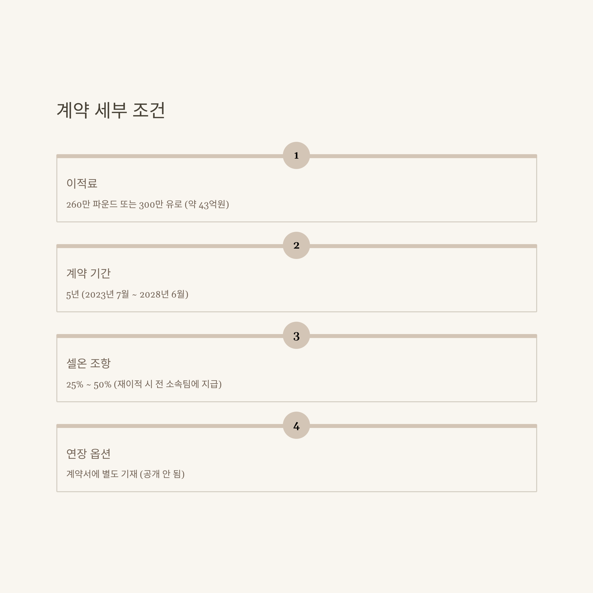 셀온(Sell-On) 조항: 25% ~ 50% (재이적 시 전 소속팀에 지급)