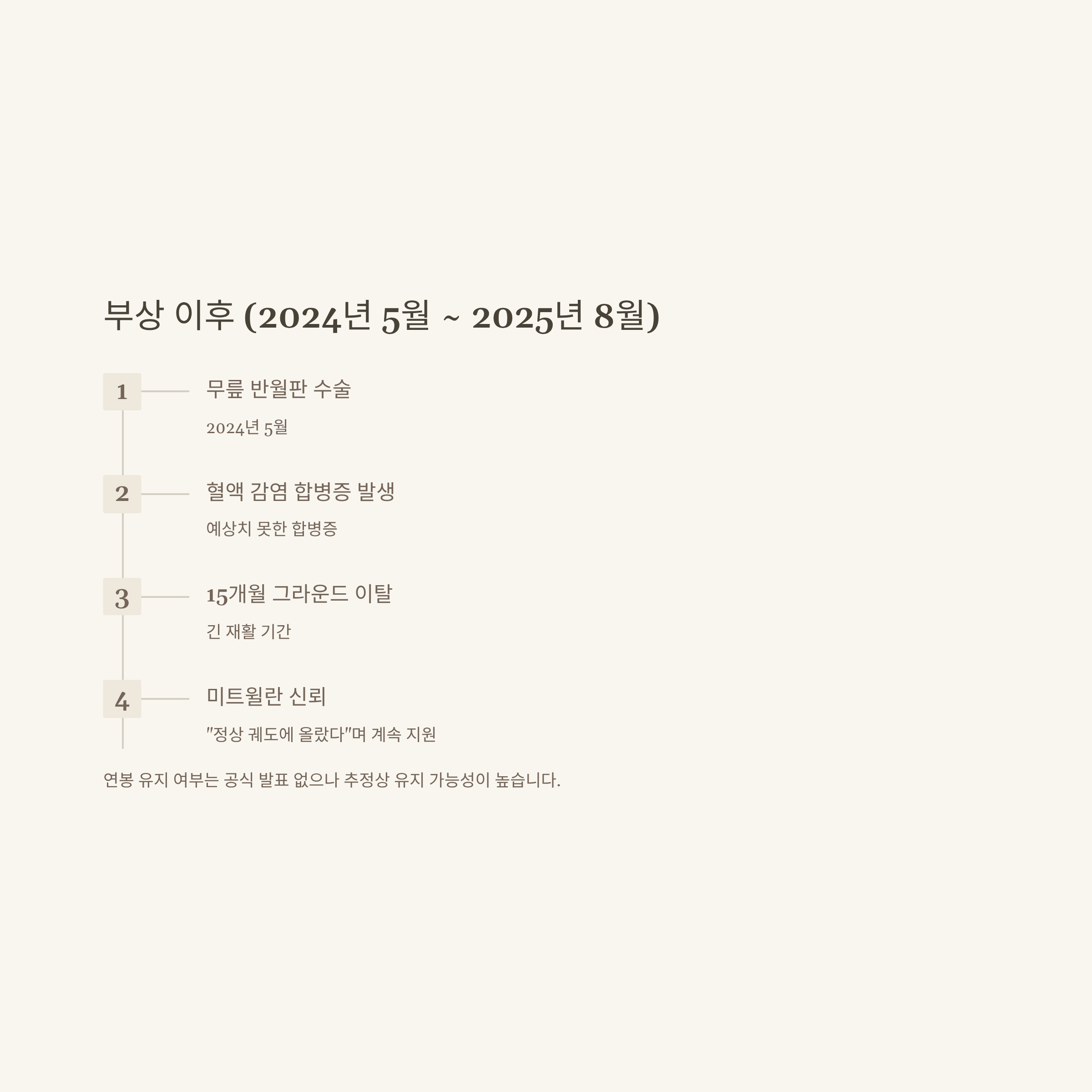 - 2024년 부상 후: 연봉 유지 (재협상 논의 중)