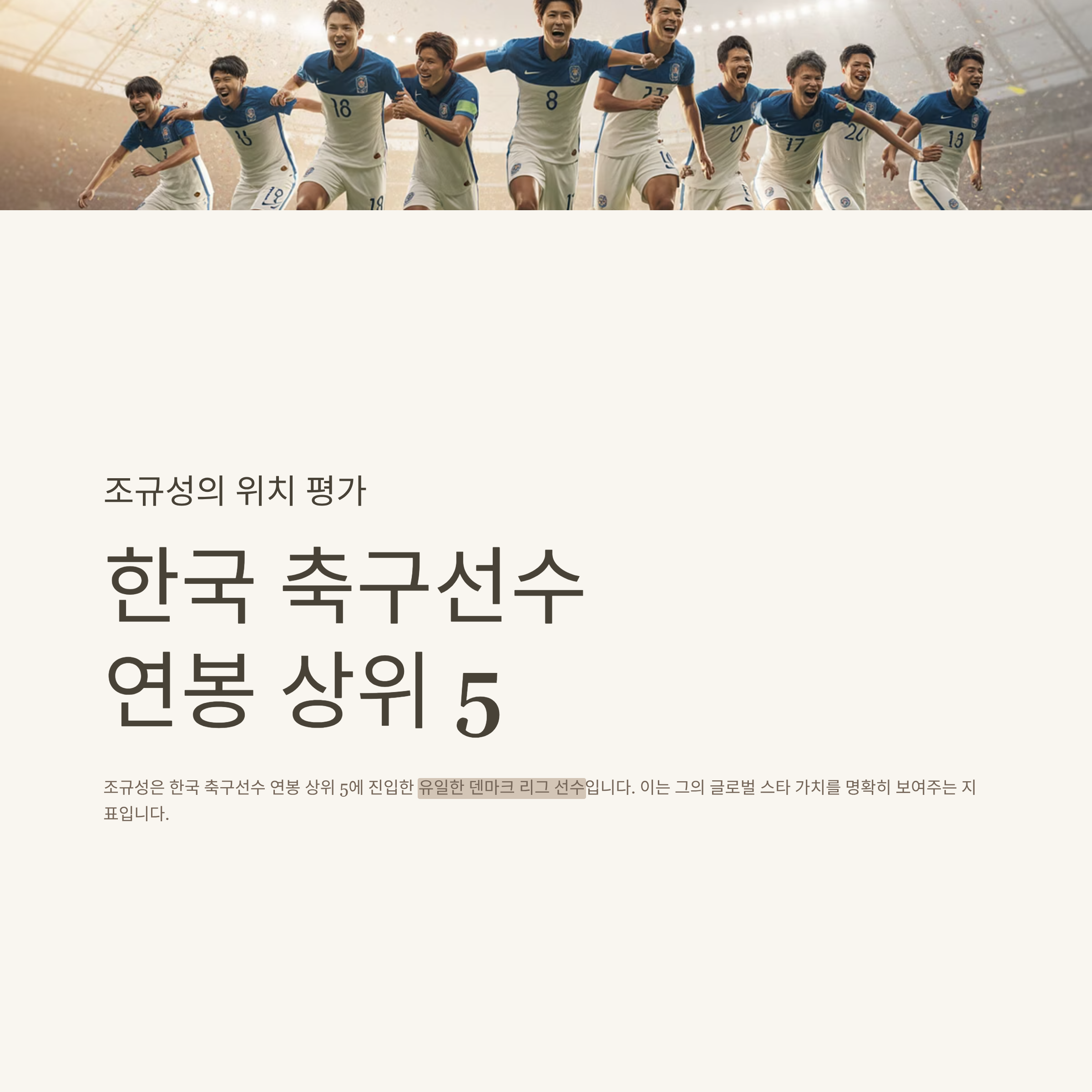 조규성은 한국 축구선수 연봉 상위 5에 진입한 유일한 덴마크 리그 선수입니다. 이는 그의 글로벌 스타 가치를 명확히 보여주는 지표입니다.