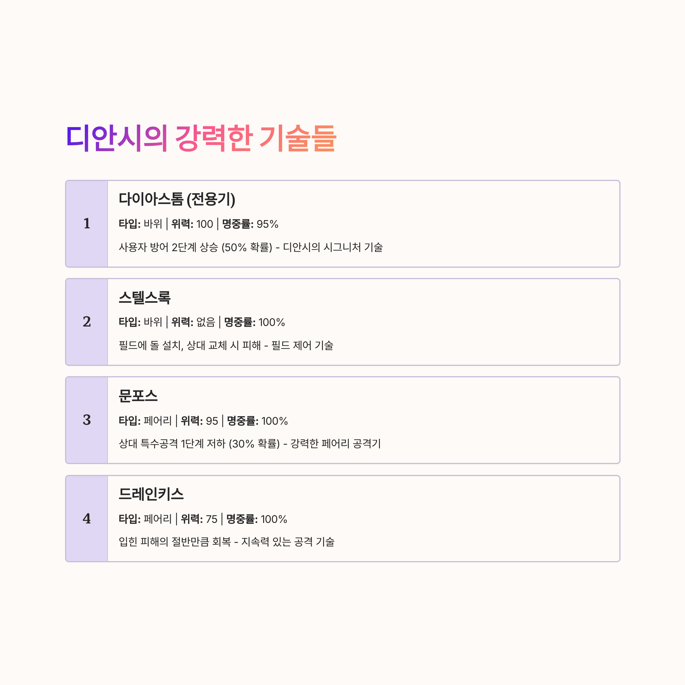 - 의미: 디안시의 시그니처 기술, 높은 위력과 방어 상승 효과
