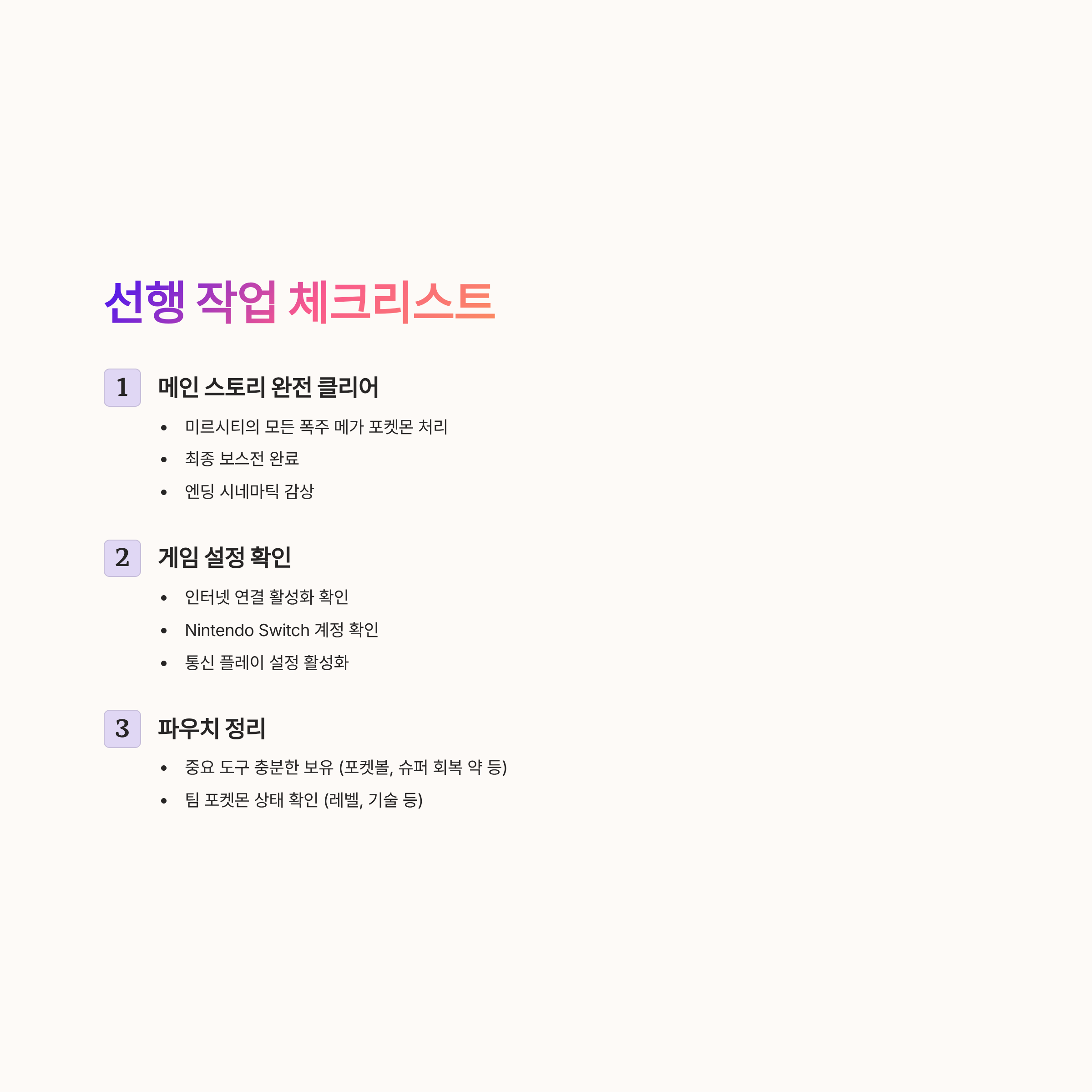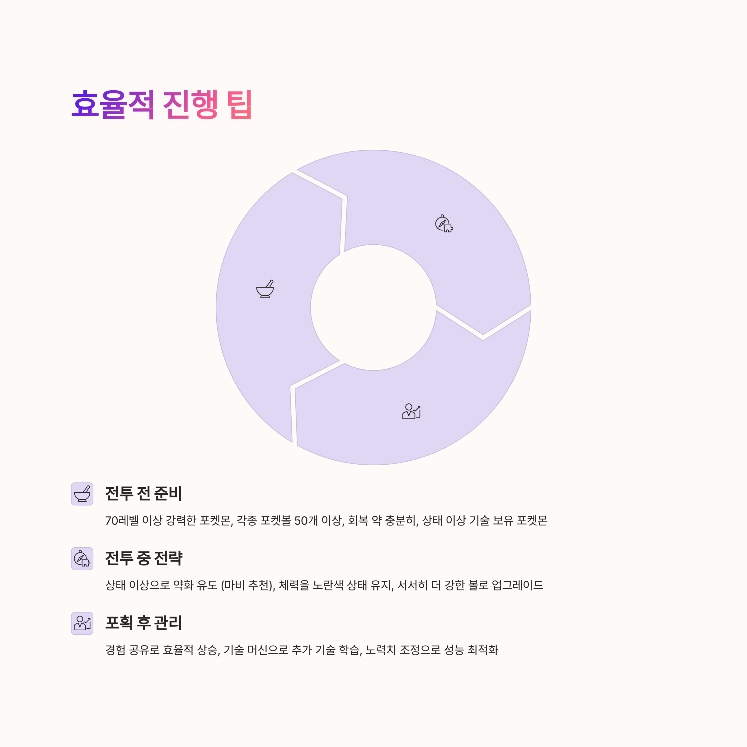 - 중요 도구 충분한 보유 (포켓볼, 슈퍼 회복 약 등)