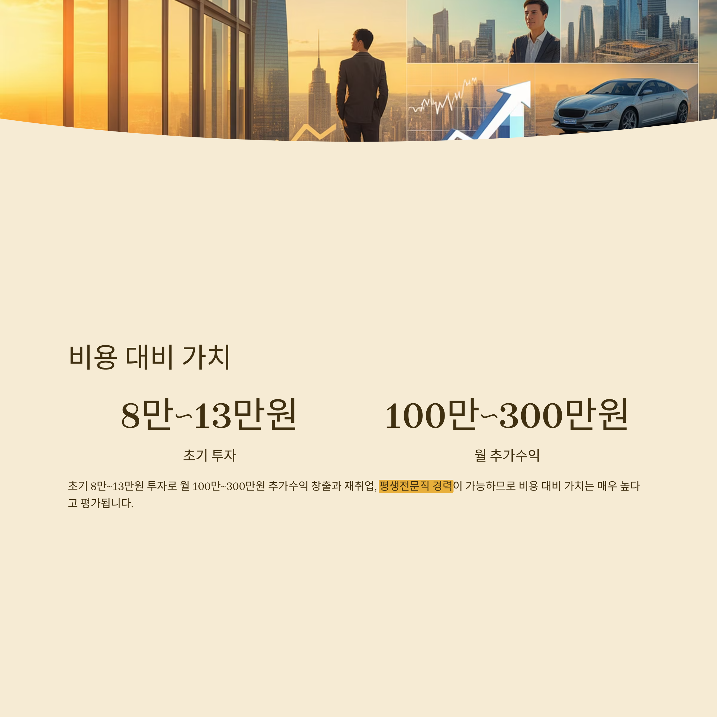 초기 8만~13만원 투자로 월 100만~300만원 추가수익 창출과 재취업, 평생전문직 경력이 가능하므로 비용 대비 가치는 매우 높다고 평가됩니다.