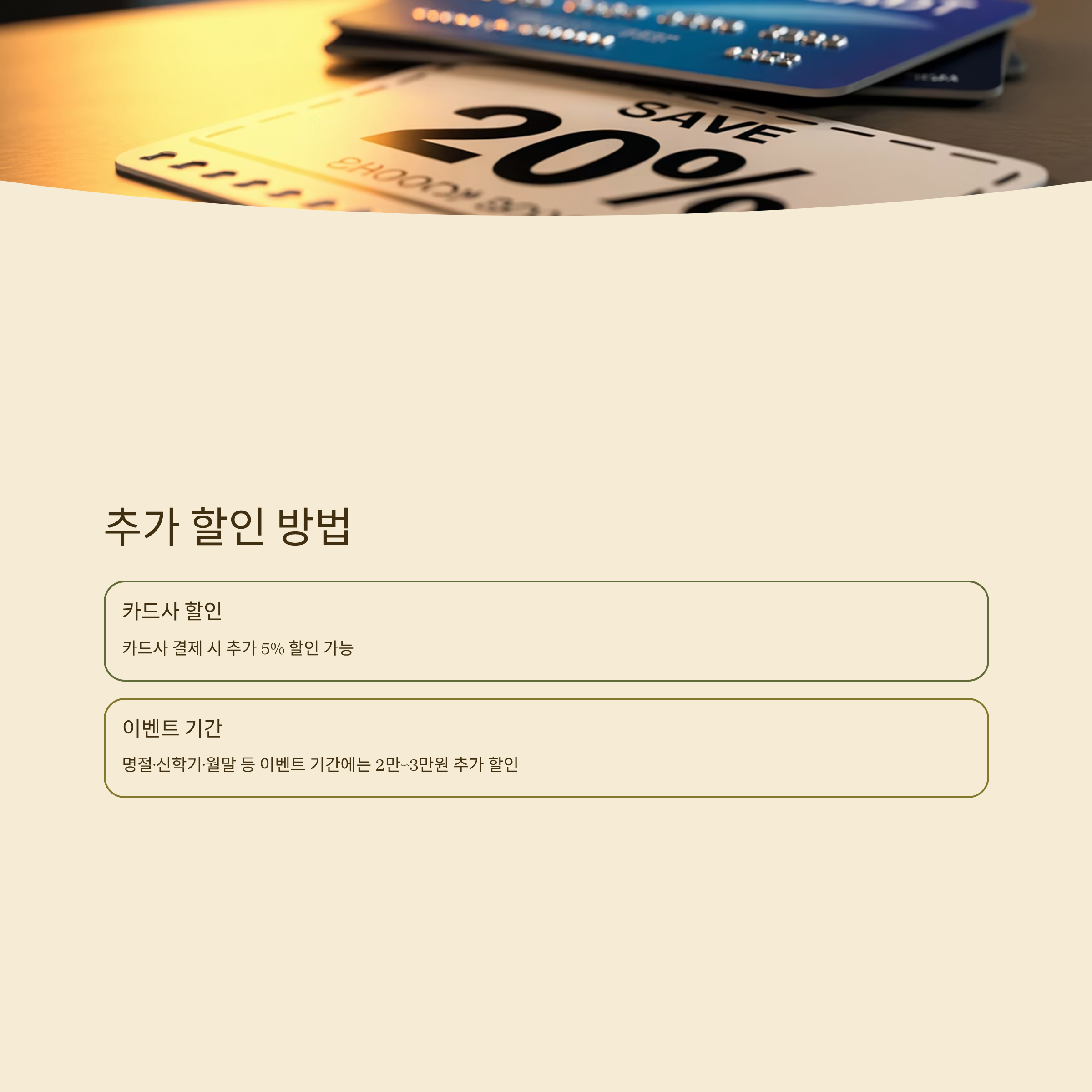 카드사 결제 시 추가 5% 할인, 명절·신학기·월말 등 이벤트 기간에는 2만~3만원 추가 할인도 자주 있습니다.