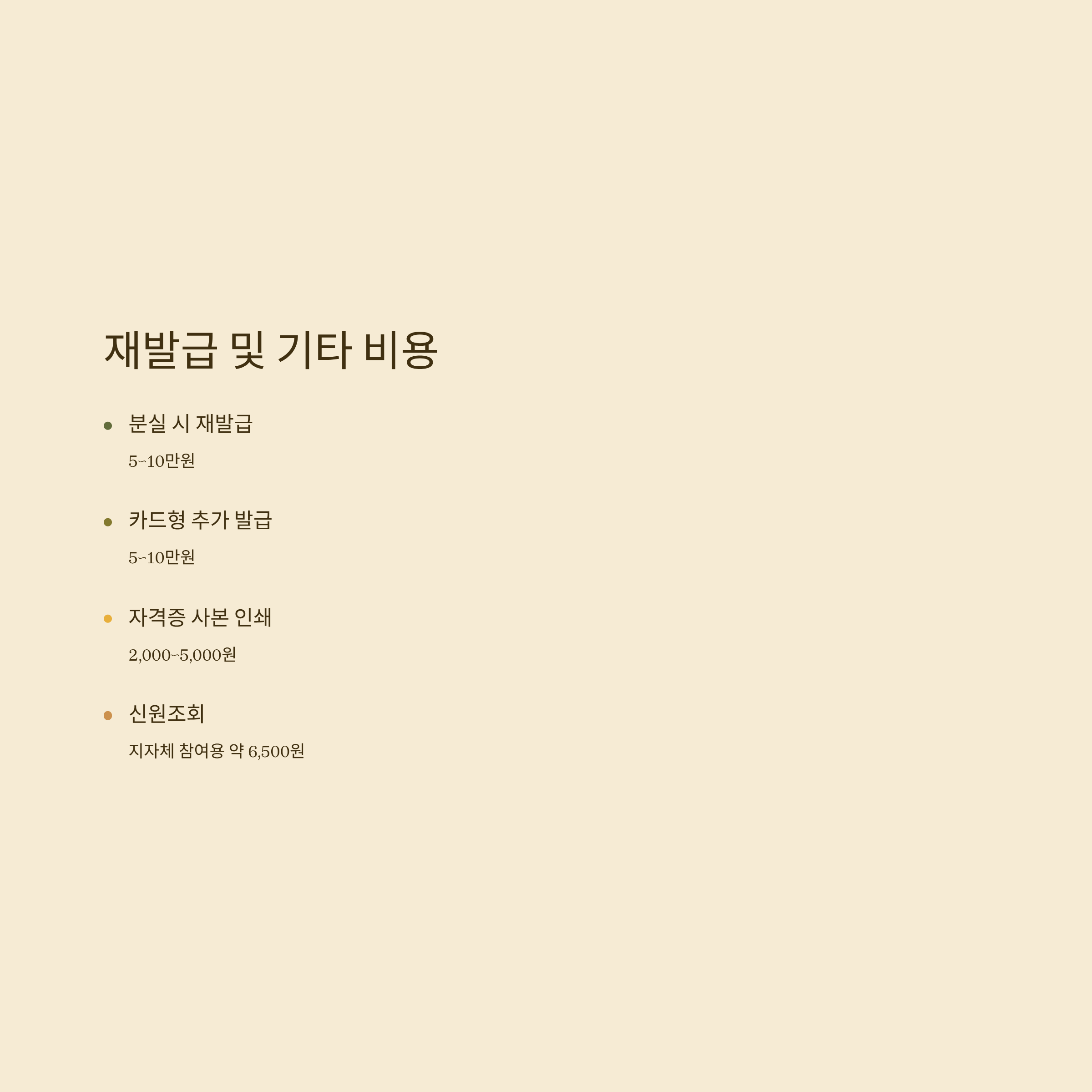 분실 시 재발급은 5~10만원, 카드형 추가 발급은 5~10만원, 자격증 사본 인쇄는 2,000~5,000원입니다.
