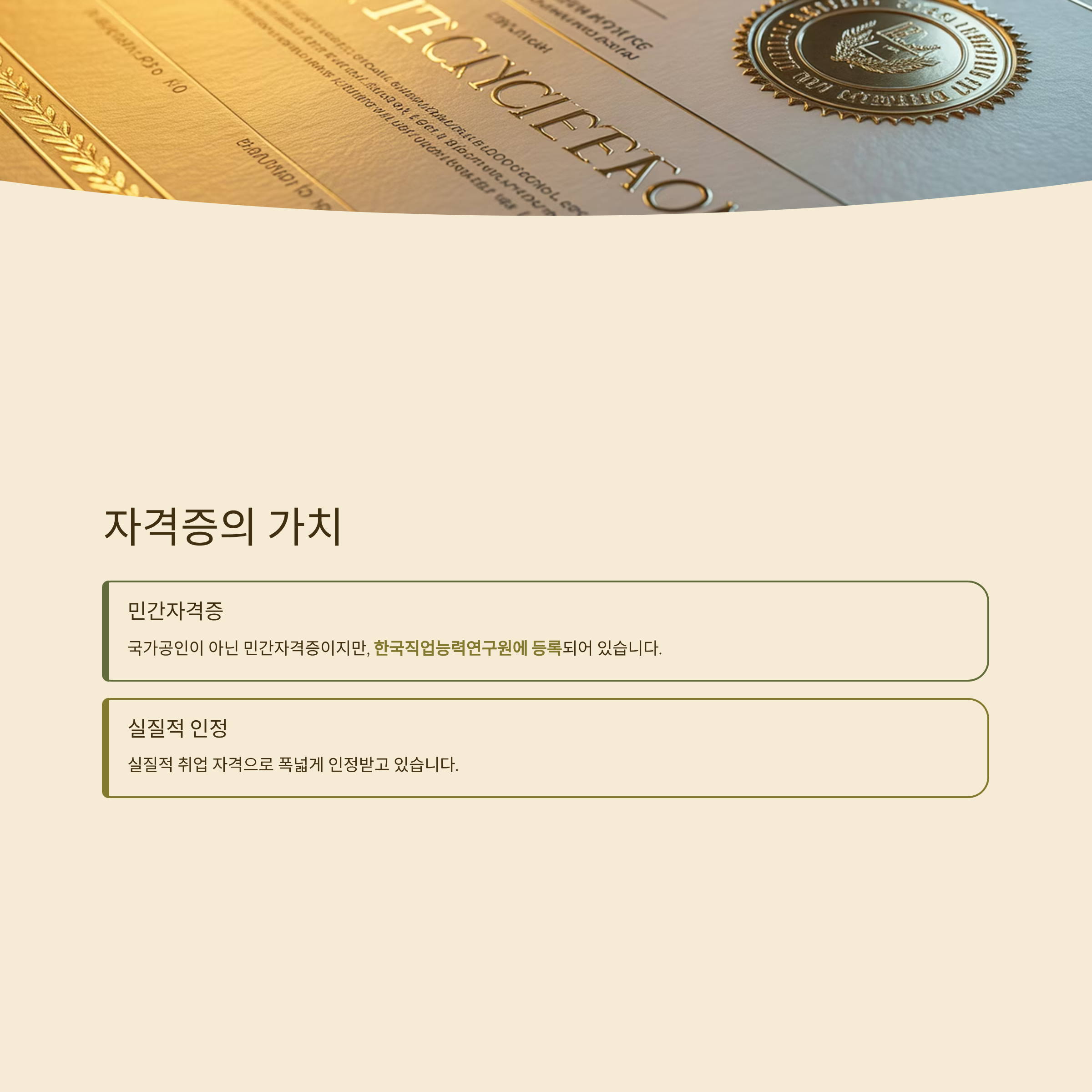 해당 자격증은 국가공인이 아닌 민간자격증이지만, 한국직업능력연구원에 등록되어 있으며 실질적 취업 자격으로 폭넓게 인정받습니다.