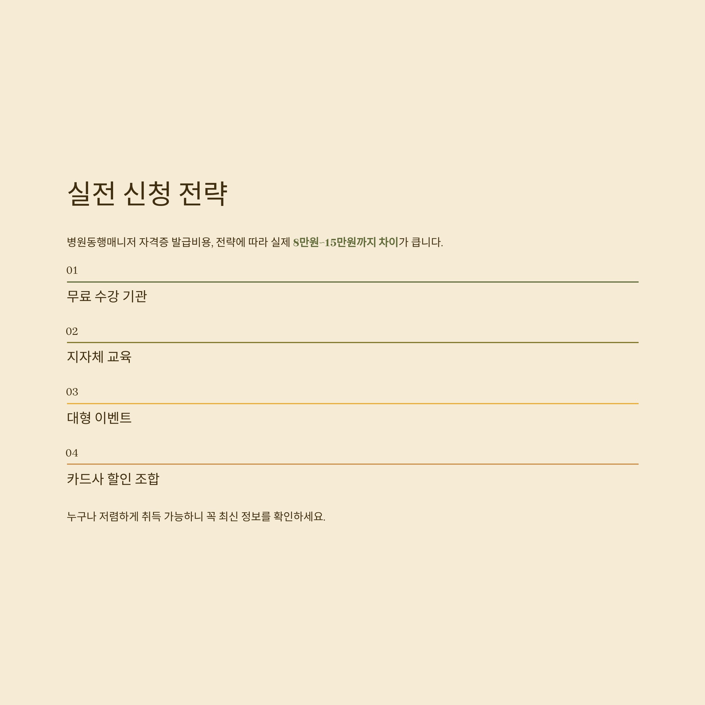 병원동행매니저 자격증 발급비용, 전략에 따라 실제 8만원~15만원까지 차이가 큽니다.