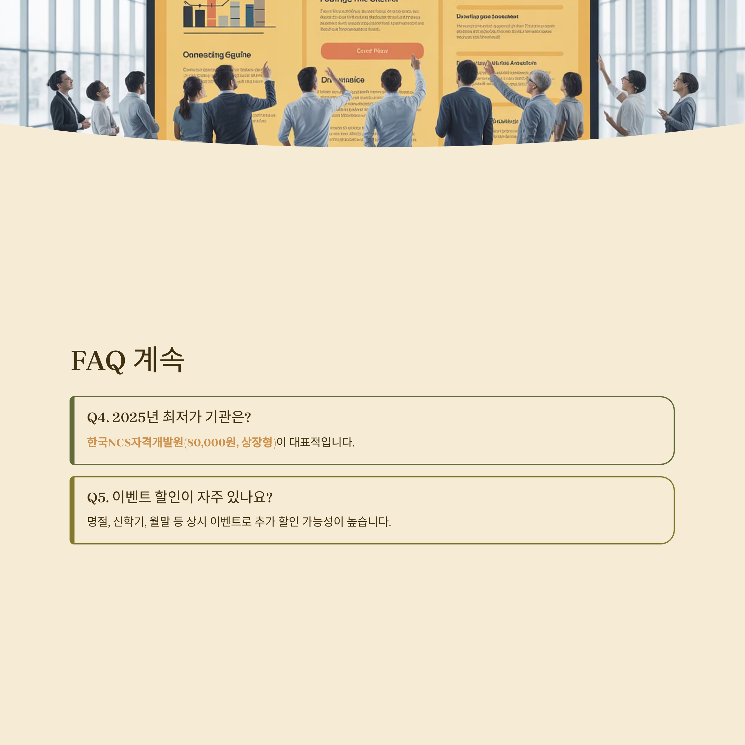 Q4. 2025년 최저가 기관은? A. 한국NCS자격개발원(80,000원, 상장형)이 대표적입니다.