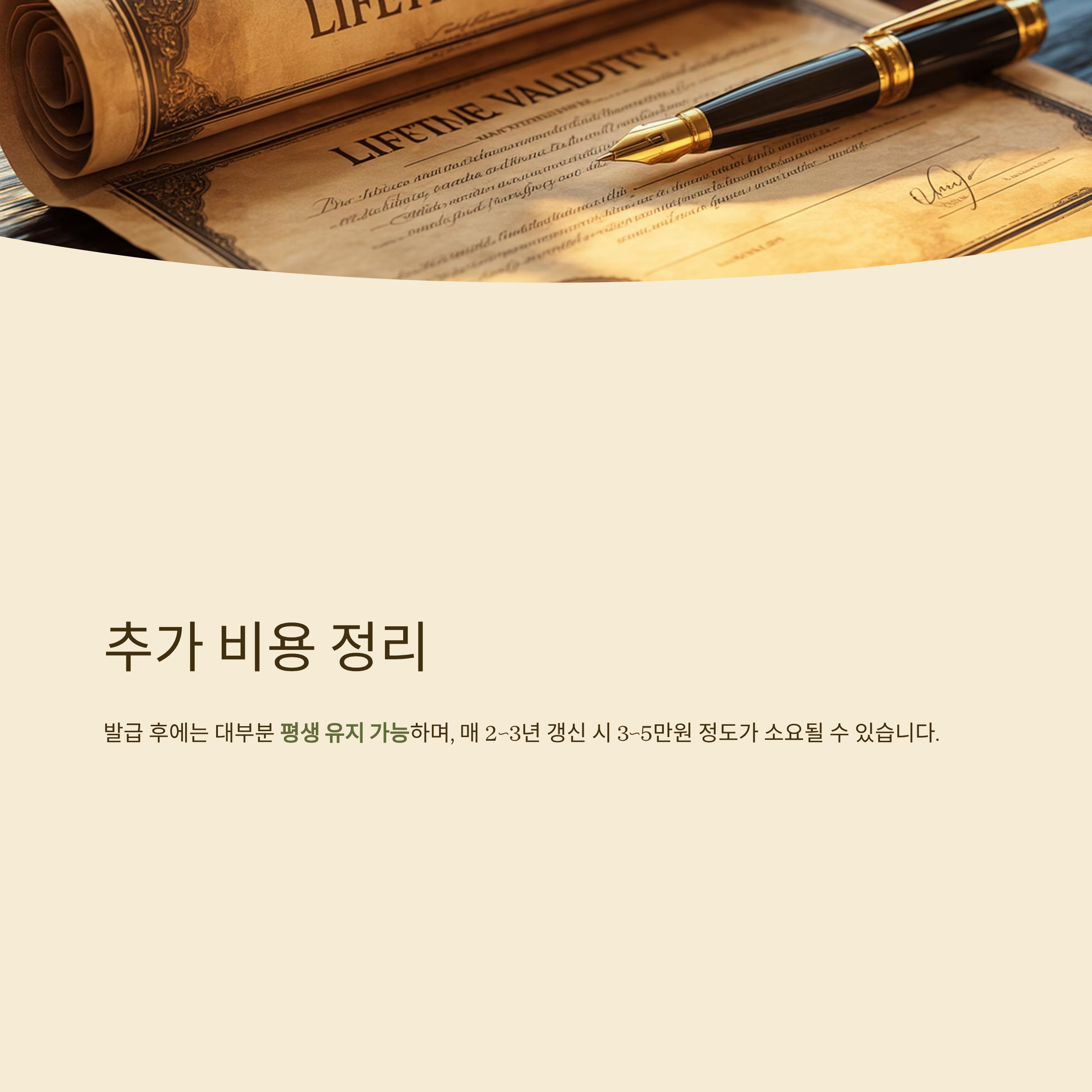 발급 후에는 대부분 평생 유지 가능하며, 매 2~3년 갱신 시 3~5만원 정도가 소요될 수 있습니다.