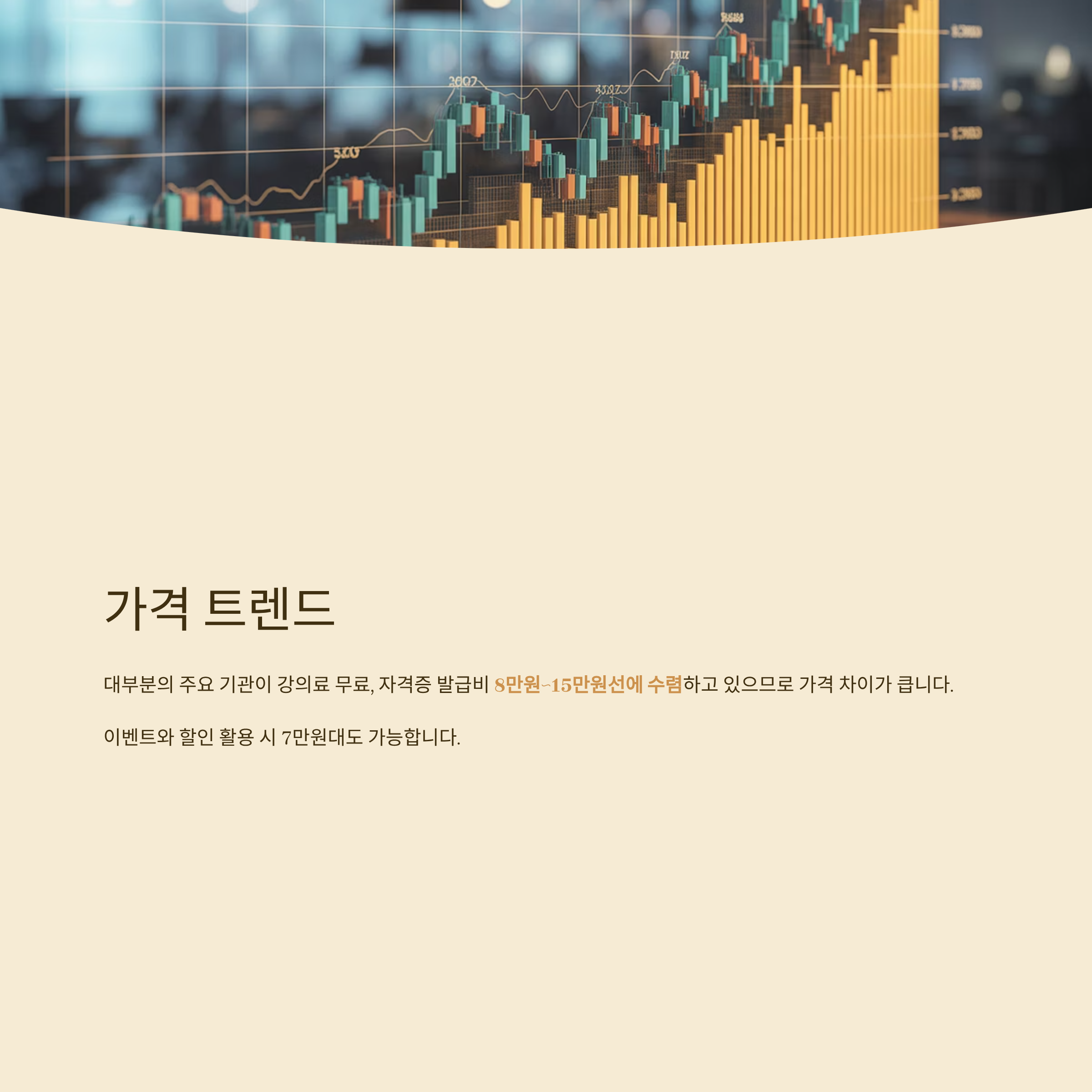 대부분의 주요 기관이 강의료 무료, 자격증 발급비 8만원~15만원선에 수렴하고 있으므로 가격 차이가 큽니다.