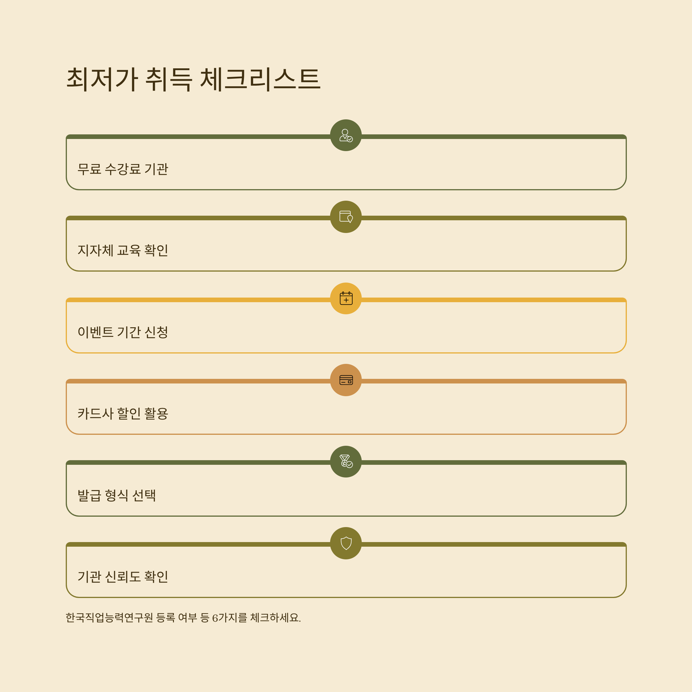 최저가 취득을 원한다면, 무료 수강료 기관 선택, 지자체 교육 유무 확인, 이벤트 기간 신청, 카드사 할인 활용, 추천코드 및 발급 형식(상장/카드) 선택 그리고 기관의 신뢰도(한국직업능력연구원 등록 여부) 등 6가지를 체크하세요.