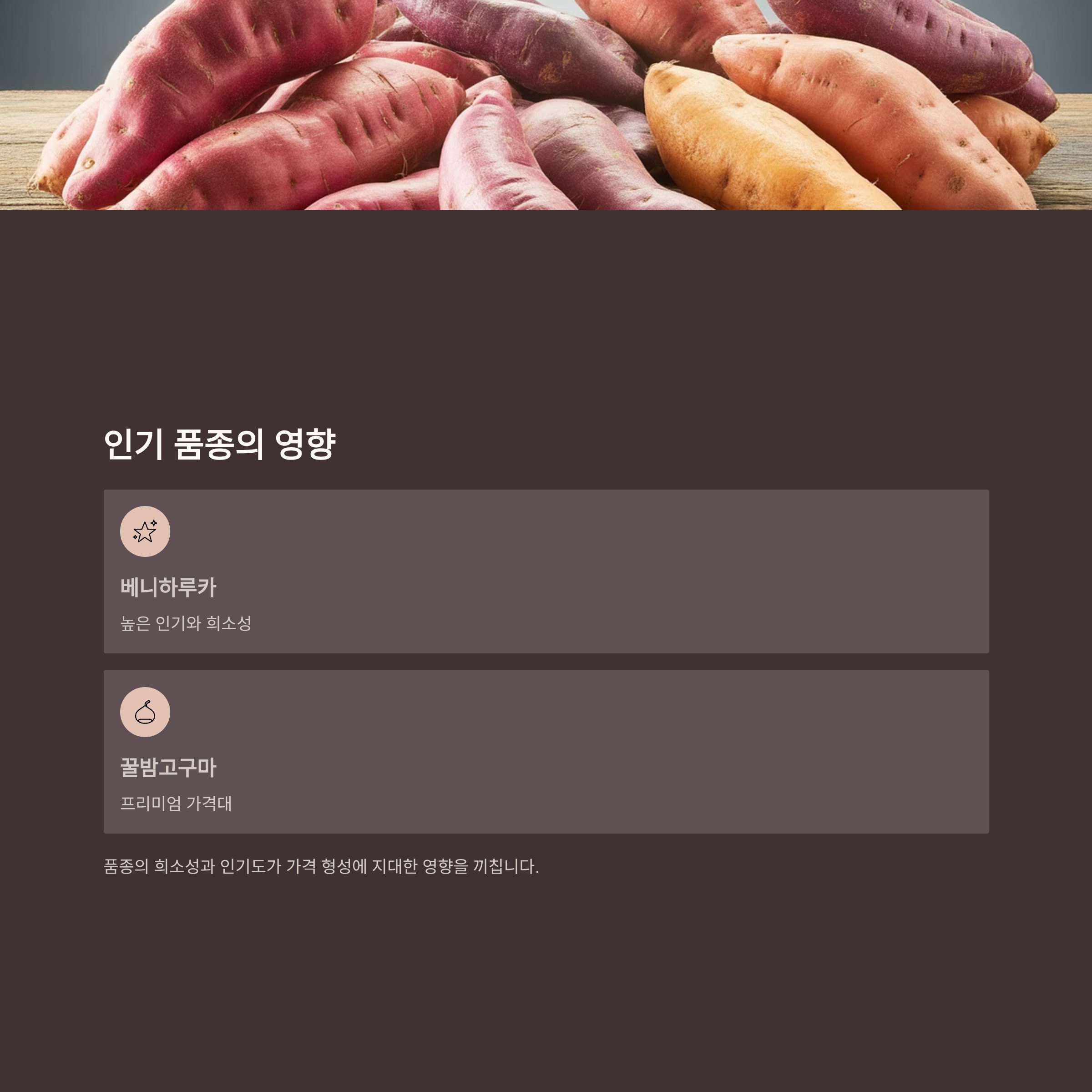 베니하루카, 꿀밤고구마 등 품종의 희소성과 인기 또한 가격 형성에 지대한 영향을 끼칩니다.