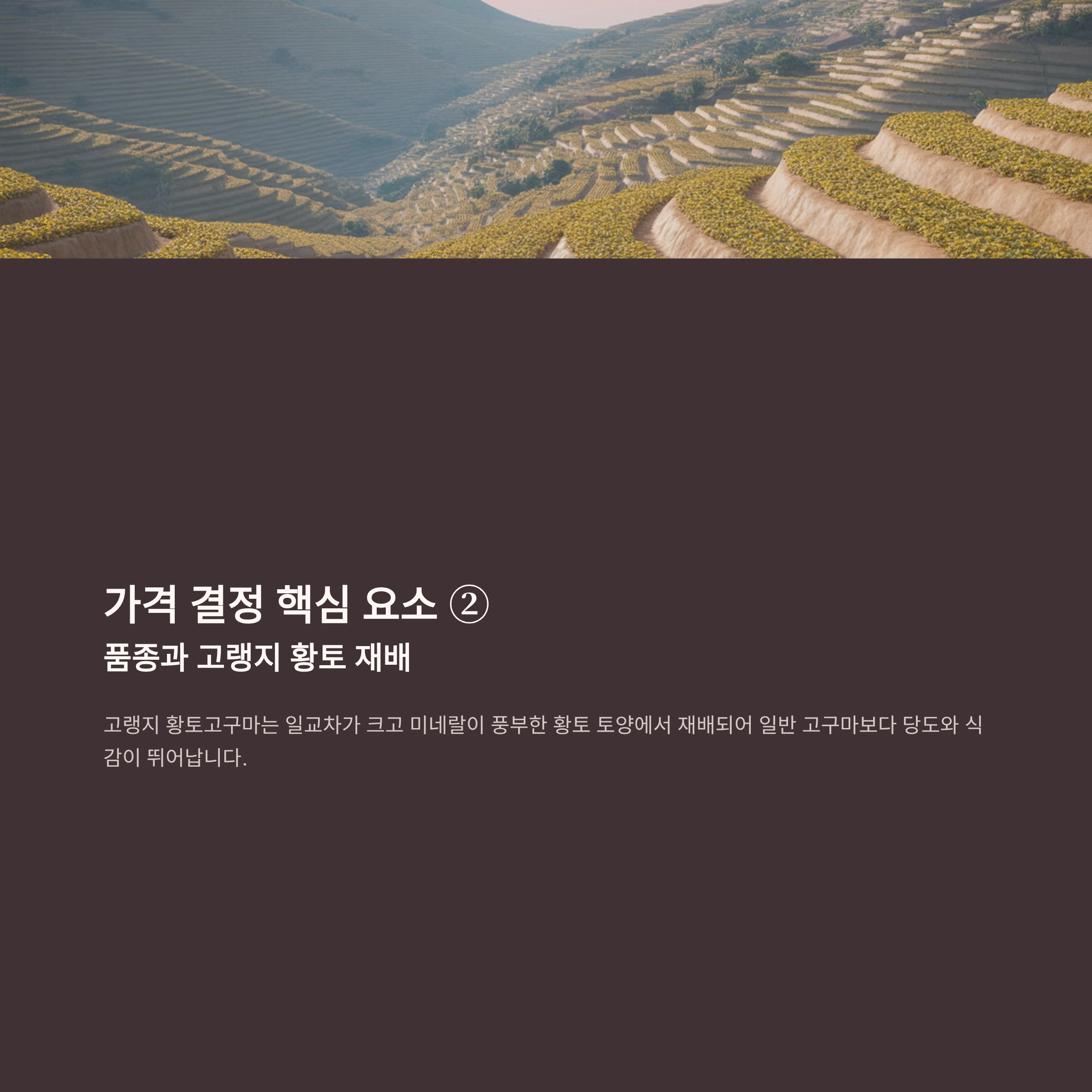 ‘고랭지 황토고구마’는 일교차가 크고 미네랄이 풍부한 황토 토양에서 재배되어 일반 고구마보다 당도와 식감이 뛰어납니다.