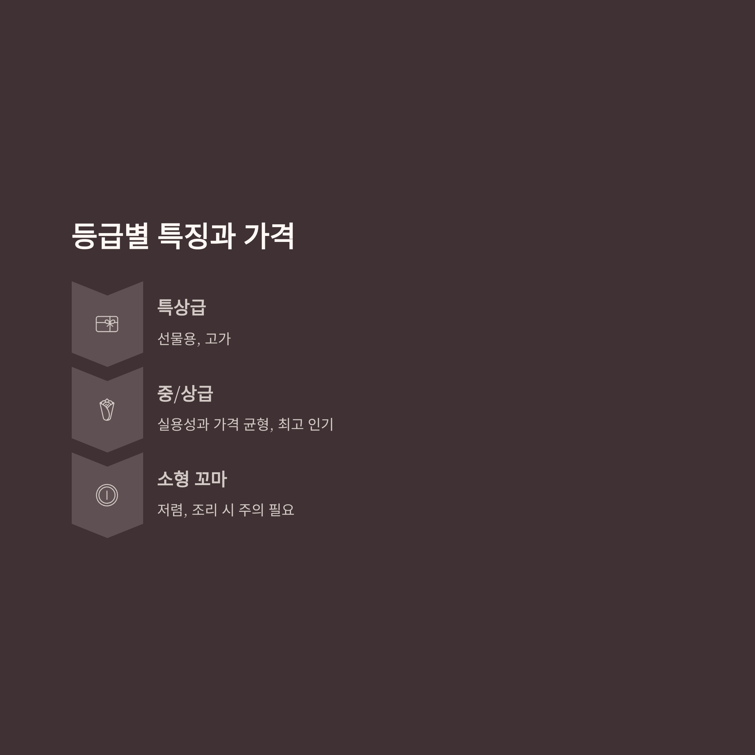 특상급은 선물용으로 고가이며, 중/상 등급은 실용성과 가격의 균형을 갖춘 가장 인기 있는 구매 대상입니다.