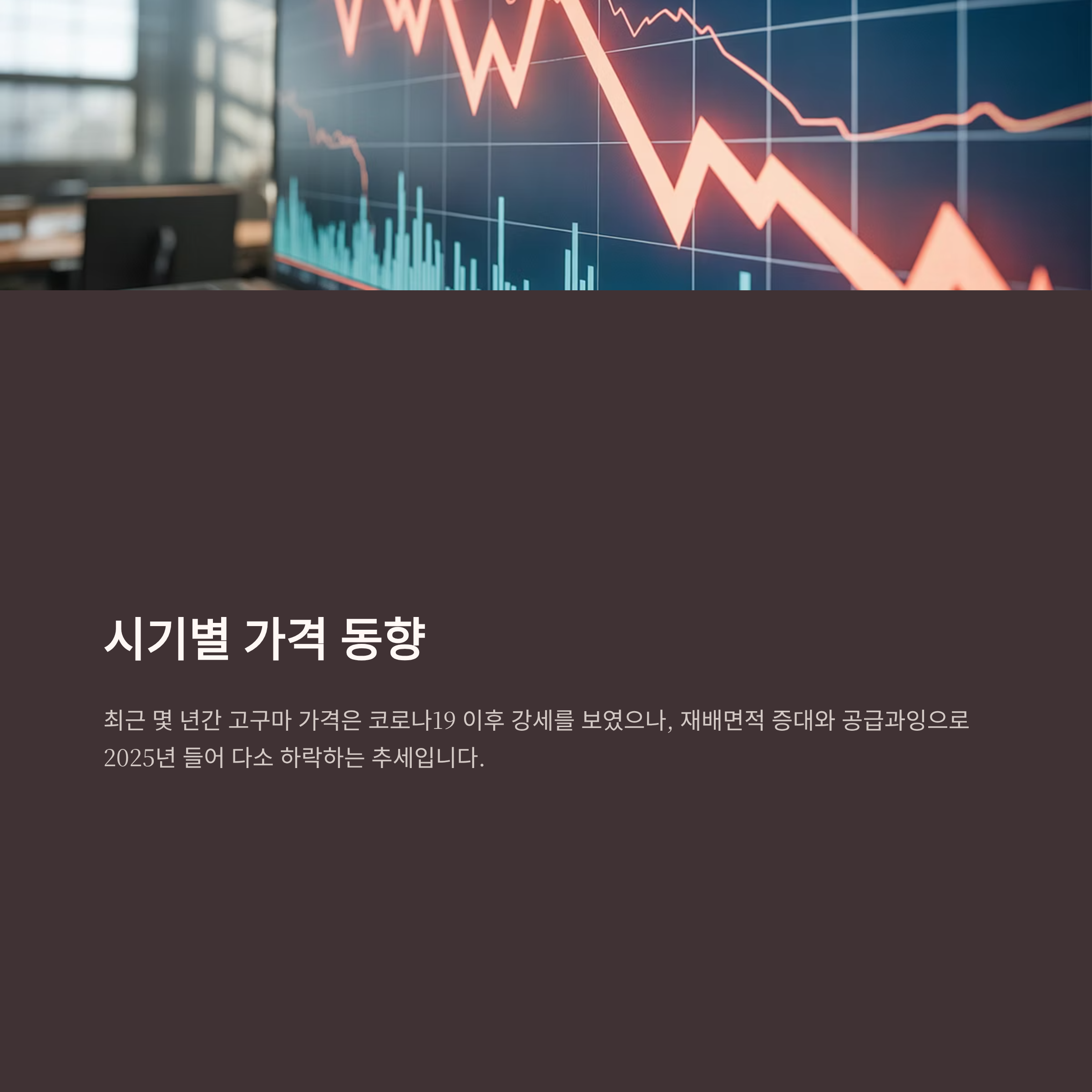 최근 몇 년간 고구마 가격은 코로나19 이후 강세를 보였으나, 재배면적 증대와 공급과잉으로 2025년 들어 다소 하락하는 추세입니다.